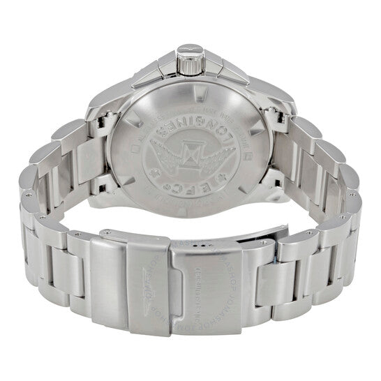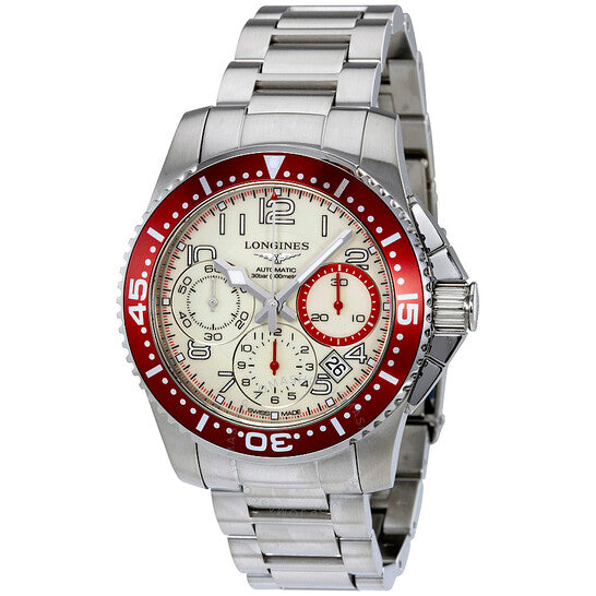 علبة من الفولاذ المقاوم للصدأ مع سوار من الفولاذ المقاوم للصدأ. إطار دوار أحادي الاتجاه من الفولاذ المقاوم للصدأ بحلقة علوية حمراء. ميناء بيج مع عقارب فضية مضيئة وعلامات ساعات بأرقام عربية. علامات دقائق حول الحافة الخارجية. نوع الميناء: تناظري. عقارب وعلامات مضيئة. عرض التاريخ بين موضعي الساعة الرابعة والخامسة. كرونوغراف - ثلاثة أقراص فرعية تعرض: ٦٠ ثانية، ٣٠ دقيقة، و١٢ ساعة. حركة لونجين أوتوماتيكية من عيار L688.2 مع احتياطي طاقة ٥٤ ساعة. كريستال ياقوت مقاوم للخدش. تاج لولبي. غطاء خلفي صلب. حجم العلبة: ٤١ مم. شكل دائري. قابلة للطي مع مشبك أمان. مقاومة للماء حتى عمق ٣٠٠ متر / ١٠٠٠ قدم. الوظائف: كرونوغراف، تاريخ، ساعة، دقيقة، ثانية. طراز ساعة فاخرة. علامة الساعة: صناعة سويسرية. ساعة لونجين هيدروكونكويست كرونوغراف أوتوماتيكية للرجال L3.696.4.19.6.