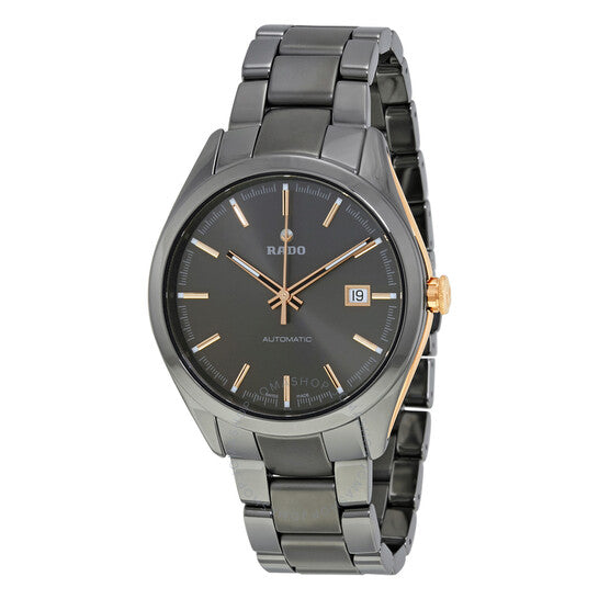 علبة من السيراميك عالي التقنية من البلازما مع لمسات من الذهب الوردي بتقنية PVD. سوار من السيراميك عالي التقنية من البلازما مع وصلات من التيتانيوم الأسود. إطار ثابت من السيراميك عالي التقنية من البلازما. ميناء رمادي مع عقارب مضيئة وعلامات ساعات ذهبية وردية. علامات دقائق حول الحافة الخارجية. نوع الميناء: تناظري. عقارب وعلامات مضيئة. عرض التاريخ عند موضع الساعة 3. حركة أوتوماتيكية من رادو عيار 629 (ETA 2892-A2) مع احتياطي طاقة لمدة 42 ساعة. زجاج ياقوت مقاوم للخدش. غطاء خلفي شفاف. شكل دائري. حجم العلبة: 42 مم. سُمك العلبة: 10.2 مم. مشبك قابل للطي. مقاومة للماء حتى عمق 100 متر / 330 قدمًا. الوظائف: التاريخ، الساعة، الدقيقة، الثانية. طراز ساعة رسمية. علامة الساعة: صناعة سويسرية. ساعة رادو هايبركروم أوتوماتيكية للرجال بمينا رمادي، R32119102