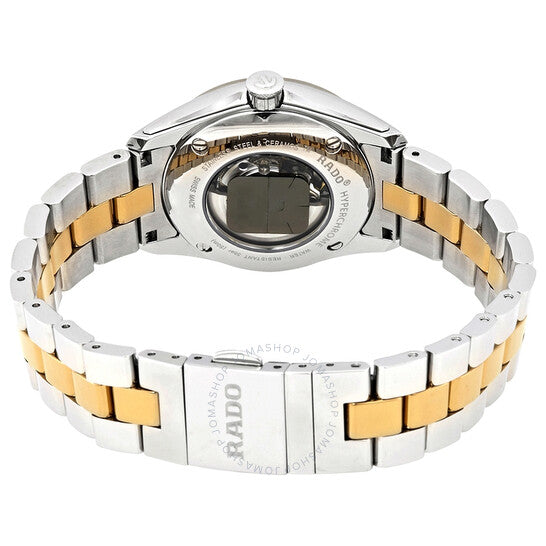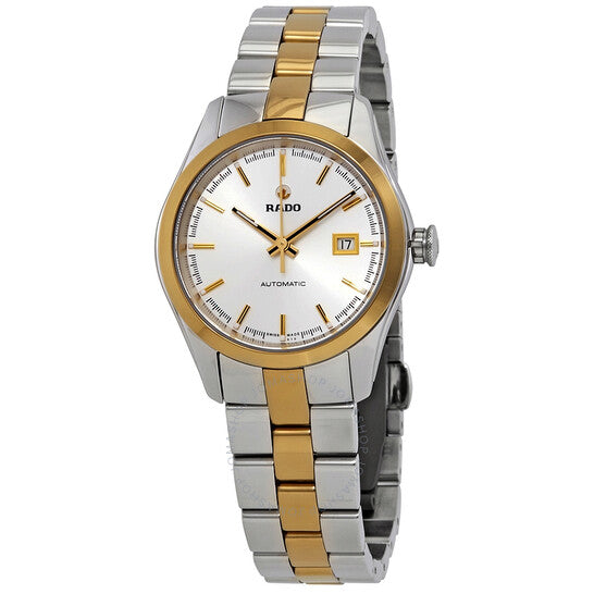 علبة من الفولاذ المقاوم للصدأ مع سوار من الفولاذ المقاوم للصدأ مع وصلات مركزية من السيراميك الذهبي. إطار ثابت من السيراميك الذهبي. ميناء فضي مع عقارب وعلامات ساعات ذهبية مضيئة. علامات دقائق حول الحافة الخارجية. نوع الميناء: تناظري. عقارب وعلامات مضيئة. عرض التاريخ عند موضع الساعة الثالثة. حركة أوتوماتيكية من رادو عيار 580 (ETA 2681)، مبنية على ETA 2681، تحتوي على 25 جوهرة، تنبض بمعدل 28800 ذبذبة في الساعة، ولديها احتياطي طاقة لمدة 38 ساعة تقريبًا. زجاج من الياقوت المقاوم للخدش. تاج قابل للسحب/الدفع. غطاء خلفي شفاف. شكل دائري. حجم العلبة: 30.6 مم. سمكها: 10 مم. مشبك مخفي قابل للطي. مقاومة للماء حتى عمق 50 مترًا / 165 قدمًا. الوظائف: التاريخ، الساعة، الدقيقة، الثانية. سلسلة هايبركروم. تصميم ساعة كاجوال. ملصق الساعة: صناعة سويسرية. ساعة رادو هايبركروم أوتوماتيكية بمينا فضي للسيدات R32088102.