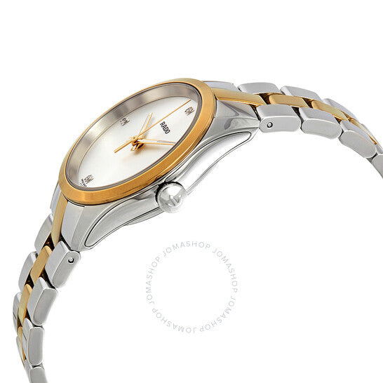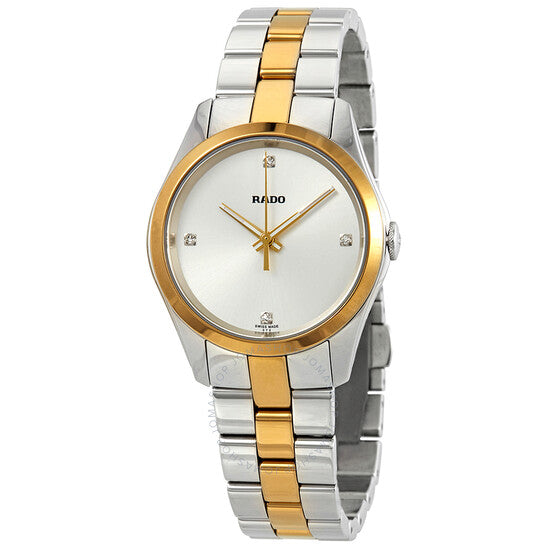 علبة من الفولاذ المقاوم للصدأ مع سوار من الفولاذ المقاوم للصدأ، مع وصلات مركزية من السيراميك الذهبي الأصفر. إطار ثابت من السيراميك الذهبي الأصفر. ميناء فضي مع عقارب مضيئة بلون الذهب الأصفر. مرصعة بالألماس عند مواضع الساعة 3 و6 و9 و12. نوع الميناء: تناظري. عقارب مضيئة. حركة كوارتز. زجاج ياقوت مقاوم للخدش. تاج قابل للسحب/الدفع. غطاء خلفي صلب. شكل دائري. حجم العلبة: 31.5 مم. مشبك قابل للطي مرتين. مقاومة للماء حتى عمق 50 مترًا / 165 قدمًا. الوظائف: الساعات، الدقائق، الثواني. طراز ساعة رسمية. علامة الساعة: صناعة سويسرية. ساعة رادو هايبركروم دايموند فضية نسائية R32975722.