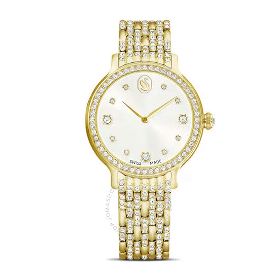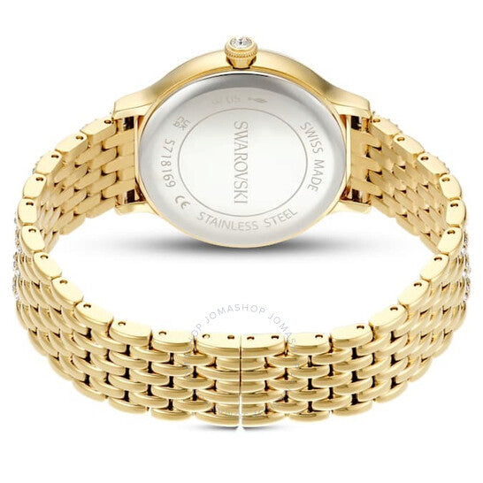 علبة وسوار معدنيان ذهبيان. إطار معدني ذهبي ثابت مرصع بـ 52 كريستالة شفافة. ميناء فضي اللون مع عقارب ذهبية اللون وعلامات ساعات من الكريستال. شعار سوان عند الساعة 12. نوع الميناء: تناظري. حركة كوارتز. كريستال معدني مقاوم للخدش. تاج قابل للسحب/الدفع. غطاء خلفي صلب. شكل دائري، مقاس العلبة: 32 مم، سمكها: 6.35 مم. مشبك فراشة. مقاومة للماء حتى عمق 50 مترًا / 165 قدمًا. الوظائف: الساعات، الدقائق. سلسلة إمبر. طراز ساعة رسمية. علامة الساعة: صناعة سويسرية. ساعة سواروفسكي إمبر كوارتز كريستال نسائية رقم 5718169.