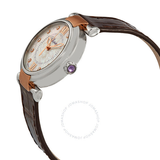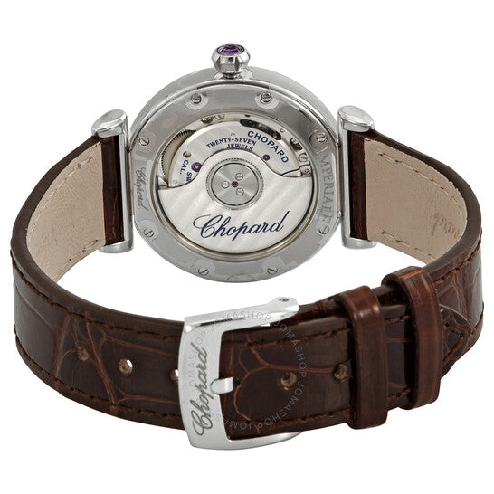 علبة من الفولاذ المقاوم للصدأ مع سوار من جلد التمساح البني. عروات من الذهب الوردي. إطار ثابت من الفولاذ المقاوم للصدأ. ميناء من عرق اللؤلؤ مع عقارب مضيئة من الذهب الوردي وعلامات ساعات من الماس. تظهر أرقام رومانية عند موضعي الساعة 6 و12. علامات دقائق حول حلقة داخلية. نوع الميناء: تناظري. عقارب مضيئة. حركة أوتوماتيكية من عيار شوبارد 09.01-C، تحتوي على 27 جوهرة، تنبض بتردد 25200 ذبذبة في الساعة، ولديها احتياطي طاقة لمدة 42 ساعة تقريبًا. زجاج من الياقوت المقاوم للخدش. تاج قابل للسحب/الدفع. غطاء خلفي شفاف. شكل دائري. حجم العلبة: 29 مم. مشبك قابل للطي. مقاومة للماء حتى عمق 50 مترًا / 150 قدمًا. الوظائف: الساعة، الدقيقة، الثانية. سلسلة إمبيريال. تصميم ساعة فاخرة. علامة الساعة: صناعة سويسرية. ساعة شوبارد إمبيريال أوتوماتيكية نسائية مرصعة بالألماس 388563-6013.