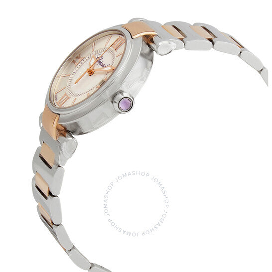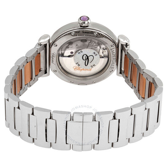 علبة من الفولاذ المقاوم للصدأ فضية اللون، مع سوار من الفولاذ المقاوم للصدأ فضي اللون مع وصلات من الذهب الوردي عيار 18 قيراطًا. إطار ثابت من الفولاذ المقاوم للصدأ فضي اللون. ميناء فضي (مركزه من عرق اللؤلؤ) مع عقارب ومؤشرات ساعات ذهبية وردية اللون. مؤشرات أرقام رومانية عند الساعة 3، 6، 9، و12. مؤشرات دقائق حول حلقة داخلية. نوع الميناء: تناظري. عقارب ومؤشرات مضيئة. عرض التاريخ عند الساعة 3. حركة أوتوماتيكية. كريستال ياقوت مقاوم للخدش. تاج قابل للسحب/الدفع. غطاء خلفي شفاف. شكل دائري، مقاس العلبة: 29 مم. طول السوار: 6.4 بوصة. مشبك قابل للطي مع مفتاح أمان. مقاومة للماء حتى عمق 50 مترًا / 165 قدمًا. الوظائف: التاريخ، الساعة، الدقيقة، الثانية. سلسلة إمبيريال. تصميم ساعة فاخرة. علامة الساعة: صناعة سويسرية. ساعة شوبارد إمبيريال أوتوماتيكية نسائية بمينا فضي 388563-6002.