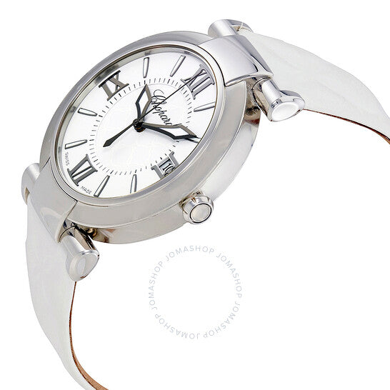 علبة من الفولاذ المقاوم للصدأ مع سوار من جلد العجل الأبيض. إطار ثابت من الفولاذ المقاوم للصدأ. ميناء أبيض مع عقارب سوداء مضيئة ومؤشرات ساعات. أرقام رومانية تُشير إلى الساعات 3 و6 و9 و12. علامات دقائق حول حلقة داخلية. نوع الميناء: تناظري. عقارب ومؤشرات مضيئة. عرض التاريخ عند الساعة 3. حركة أوتوماتيكية من عيار شوبارد 01.01-C مع احتياطي طاقة لمدة 60 ساعة. زجاج ياقوت مقاوم للخدش. تاج قابل للسحب/الدفع. غطاء خلفي شفاف. حجم العلبة: 40 مم. سُمكها: 10 مم. شكلها دائري. عرض السوار: 20 مم. مشبك تانغ. مقاومة للماء حتى عمق 50 مترًا / 165 قدمًا. الوظائف: التاريخ، الساعة، الدقائق، الثواني. تصميم ساعة فاخرة. ملصق الساعة: صناعة سويسرية. إصدارات المنتج: CP388531 3007، CP388531.3007، CP3885313007. ساعة شوبارد إمبريال أوتوماتيكية للسيدات 388531-3007.