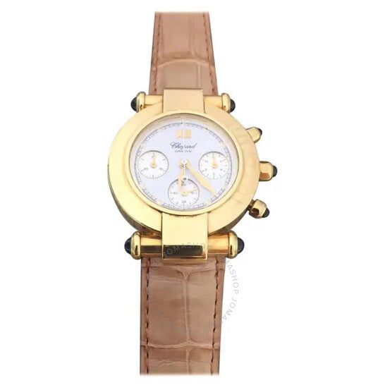 علبة من الذهب الأصفر عيار 18 قيراطًا، بسوار من جلد التمساح البني. إطار ثابت من الذهب الأصفر عيار 18 قيراطًا. ميناء أبيض بعقارب وعلامات ساعات ذهبية اللون. علامات دقائق حول الحافة الخارجية. نوع الميناء: تناظري. كرونوغراف - ثلاثة أقراص فرعية تعرض: 60 ثانية، 30 دقيقة، و12 ساعة. حركة كوارتز. كريستال ياقوتي مقاوم للخدش. تاج كابوشون. غطاء خلفي صلب. شكل دائري، مقاس العلبة: 40 مم. مشبك تانغ. الوظائف: كرونوغراف، ساعات، دقائق، ثوانٍ. سلسلة إمبيريال. طراز ساعة رسمية. علامة الساعة: صناعة سويسرية. ساعة شوبارد إمبيريال كرونوغراف كوارتز نسائية بمينا بيضاء، 383157-0006.
