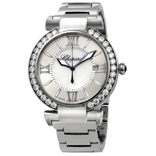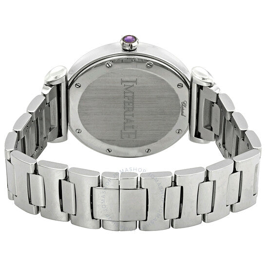 علبة من الفولاذ المقاوم للصدأ مع سوار من الفولاذ المقاوم للصدأ. إطار ثابت من الفولاذ المقاوم للصدأ مرصع بالألماس. ميناء فضي بعقارب مضيئة ومؤشرات ساعات. أرقام رومانية تُشير إلى الساعات 3 و6 و9 و12. نوع الميناء: تناظري. عرض التاريخ عند الساعة 3. حركة أوتوماتيكية من عيار Sellita SW300 مع احتياطي طاقة لمدة 42 ساعة. كريستال ياقوت مقاوم للخدش. تاج على شكل زهرة اللوتس مرصع بحجر كابوشون من الجمشت. غطاء خلفي صلب. شكل دائري. حجم العلبة: 40 مم. سمكها: 9.35 مم. مشبك مخفي قابل للطي. مقاومة للماء حتى عمق 50 مترًا / 165 قدمًا. الوظائف: الساعات، الدقائق، الثواني، التاريخ. تصميم ساعة فاخرة. علامة الساعة: صناعة سويسرية. اختلافات المنتج: 388531 3004، 388531.3004، 3885313004. ساعة شوبارد إمبيريال دايموند أوتوماتيكية 40 مم للسيدات 388531-3004.