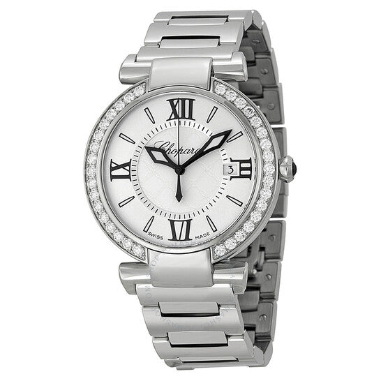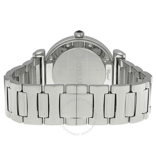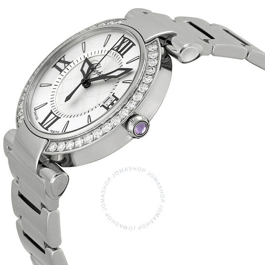 علبة وسوار من الفولاذ المقاوم للصدأ. إطار ثابت من الفولاذ المقاوم للصدأ مرصع بـ 34 ماسة. ميناء من عرق اللؤلؤ مع عقارب سوداء مضيئة ومؤشرات ساعات. أرقام رومانية تُشير إلى الساعات 3 و6 و9 و12. مؤشرات الدقائق. يظهر عرض التاريخ عند الساعة 3. آلية حركة كوارتز سويسرية. كريستال ياقوت مقاوم للخدش. تاج على شكل زهرة اللوتس مرصع بأحجار كريمة. غطاء خلفي صلب. قطر العلبة: 36 مم. سمكها: 9.75 مم. عرض السوار: 18 مم. مشبك قابل للطي مخفي. مقاومة للماء حتى عمق 50 مترًا/165 قدمًا. الوظائف: الساعات، الدقائق، الثواني، التقويم. ساعة شوبارد إمبريال نسائية بمينا من عرق اللؤلؤ 388532-3004.