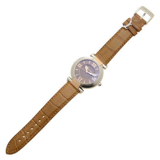 علبة فضية اللون من الفولاذ المقاوم للصدأ مع حزام بني من جلد التمساح. إطار ثابت من الفولاذ المقاوم للصدأ. ميناء بني مع مؤشرات ساعات. أرقام رومانية تُشير إلى الساعات 3 و6 و9 و12. مؤشرات دقائق حول حلقة داخلية. نوع الميناء: تناظري. عرض التاريخ عند الساعة 3. حركة كوارتز. زجاج ياقوت مقاوم للخدش. تاج قابل للسحب/الدفع. غطاء خلفي صلب. شكل دائري، مقاس العلبة: 36 مم، سمكها: 9 مم. مشبك تانغ. مقاومة للماء حتى عمق 50 مترًا / 165 قدمًا. الوظائف: التاريخ، الساعة، الدقائق، الثواني. معلومات إضافية: يتميز الهيكل بعروات مركزية من الذهب الوردي عيار 18 قيراطًا. طراز ساعة فاخر. علامة الساعة: صناعة سويسرية.
