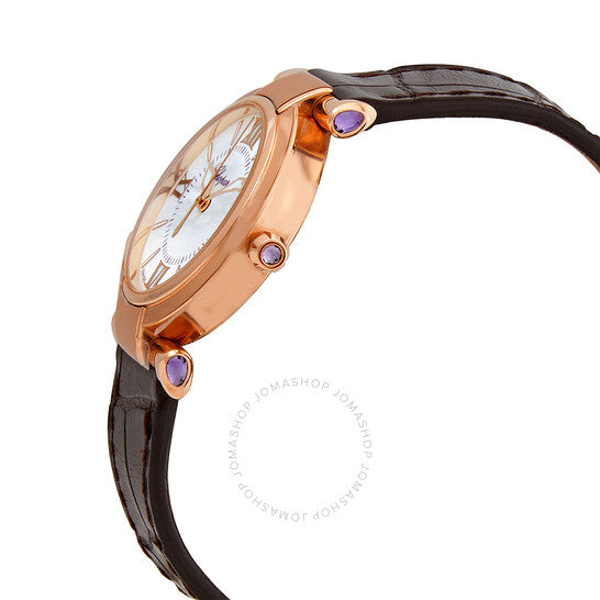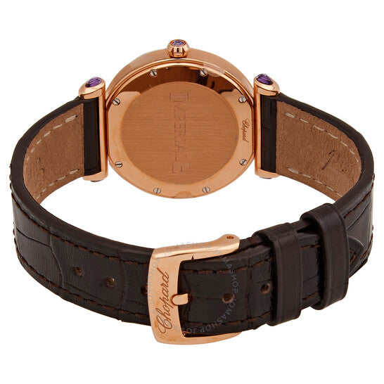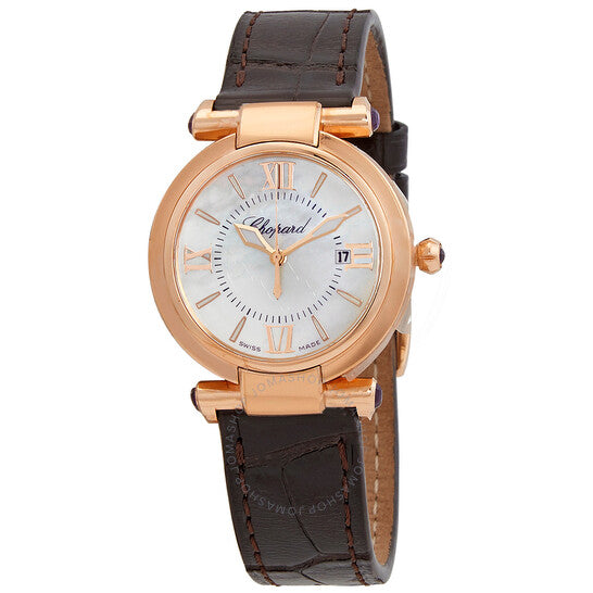 علبة من الذهب الوردي عيار ١٨ قيراطًا مع سوار من جلد التمساح البني. إطار ثابت من الذهب الوردي عيار ١٨ قيراطًا. ميناء من عرق اللؤلؤ مع عقارب مضيئة من الذهب الوردي وعلامات ساعات. تظهر الأرقام الرومانية عند الساعات ٣، ٦، ٩، و١٢. علامات الدقائق حول حلقة داخلية. عقارب وعلامات مضيئة. نافذة عرض التاريخ عند الساعة ٣. حركة كوارتز. كريستال ياقوت مقاوم للخدش. تاج قابل للسحب/الدفع. غطاء خلفي صلب. شكل دائري. حجم العلبة: ٢٨ مم. سمكها: ٩ مم. طول السوار: ٦ بوصات. مشبك تانغ. مقاومة للماء حتى عمق ٥٠ مترًا / ١٦٥ قدمًا. سلسلة إمبيريال. تصميم ساعة فاخرة. علامة الساعة: صناعة سويسرية. اختلافات المنتج: 384238 5001، 384238.5001، 3842385001. ساعة شوبارد إمبريال كوارتز للسيدات 384238-5001.