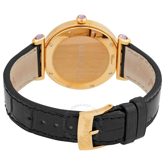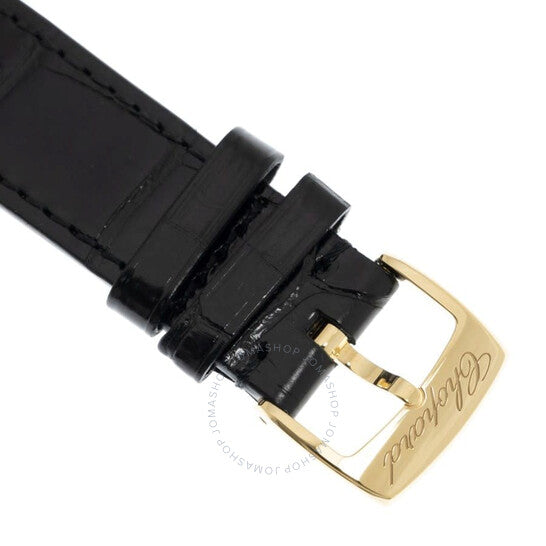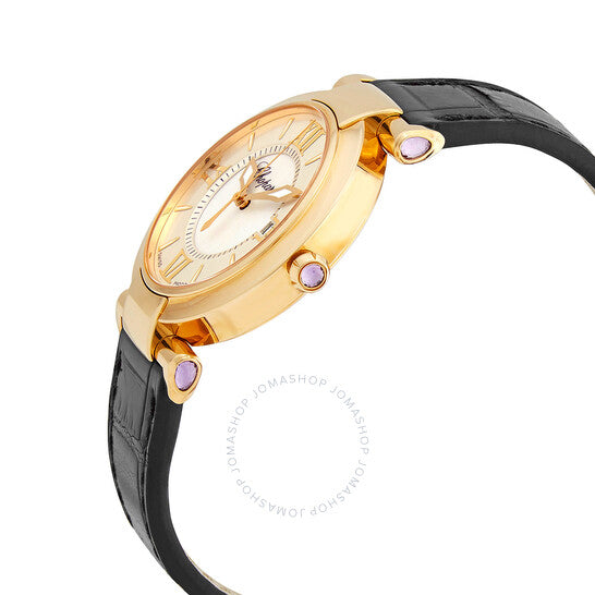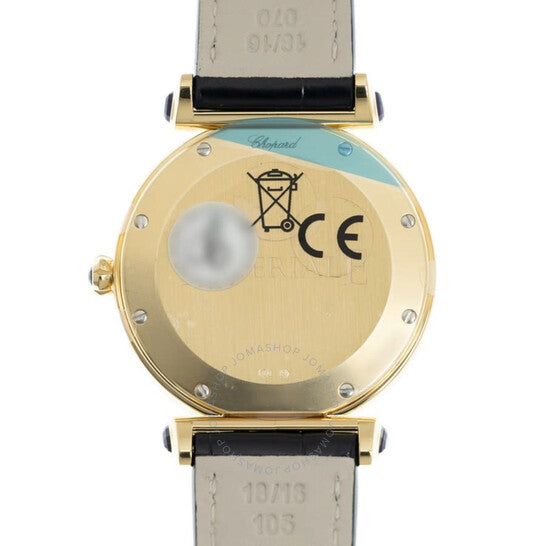 علبة من الذهب الأصفر عيار ١٨ قيراطًا مع سوار أسود من جلد التمساح. إطار ثابت من الذهب الأصفر عيار ١٨ قيراطًا. ميناء أبيض مع عقارب مضيئة بلون الذهب الأصفر وعلامات ساعات. تظهر الأرقام الرومانية عند الساعة ٣، ٦، ٩، و١٢. علامات الدقائق حول حلقة داخلية. نوع الميناء: تناظري. عقارب مضيئة. عرض التاريخ عند الساعة ٣. حركة كوارتز. زجاج ياقوت مقاوم للخدش. تاج قابل للسحب/الدفع. غطاء خلفي صلب. شكل دائري. حجم العلبة: ٣٦ مم. سمكها: ٩ مم. عرض السوار: ١٨ مم. مشبك تانغ. مقاومة للماء حتى عمق ٣٠ مترًا / ١٠٠ قدم. الوظائف: التاريخ، الساعة، الدقيقة، الثانية. معلومات إضافية: العلبة الأصلية، دليل الاستخدام (ملحقات كاملة). سلسلة إمبيريال. طراز ساعة فاخرة. ملصق الساعة: صناعة سويسرية. ساعة شوبارد إمبيريال كوارتز نسائية بمينا بيضاء، رقمها ٣٨٤٢٢١-٠٠٠١.