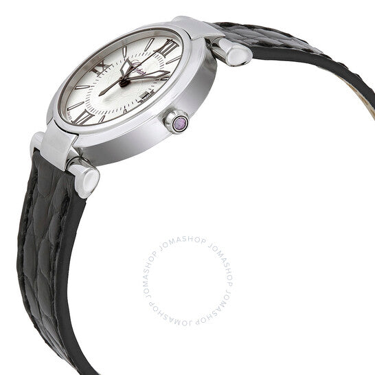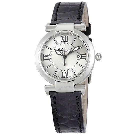 علبة من الفولاذ المقاوم للصدأ مع سوار أسود من جلد التمساح. إطار ثابت من الفولاذ المقاوم للصدأ. ميناء فضي مع عقارب سوداء مضيئة ومؤشرات ساعات. أرقام رومانية تُشير إلى الساعات 3 و6 و9 و12. مؤشرات دقائق حول الحافة الداخلية. نوع الميناء: تناظري. عقارب مضيئة. عرض التاريخ عند الساعة 3. حركة كوارتز. زجاج ياقوت مقاوم للخدش. تاج قابل للسحب/الدفع. غطاء خلفي صلب. شكل دائري. حجم العلبة: 28 مم. سمكها: 9 مم. مشبك تانغ. مقاومة للماء حتى عمق 50 مترًا / 165 قدمًا. الوظائف: التاريخ، الساعة، الدقيقة، الثانية. تصميم ساعة فاخرة. علامة الساعة: صناعة سويسرية. إصدارات المنتج: 388541 3001، 388541.3001، 3885413001. ساعة شوبارد إمبيريال النسائية بمينا فضي 388541-3001.