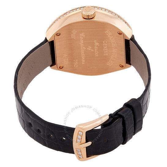 علبة من الذهب الوردي عيار ١٨ قيراطًا مع سوار جلدي أسود. إطار ثابت مرصع بالألماس من الذهب الوردي عيار ١٨ قيراطًا. ميناء من عرق اللؤلؤ مع عقارب سوداء وعلامات ساعات بأرقام عربية. نوع الميناء: تناظري. حركة كوارتز. زجاج ياقوت مقاوم للخدش. تاج قابل للسحب/الدفع. غطاء خلفي صلب. شكل العلبة: تونيو، مقاسها: ٢٩ مم. مشبك بإبزيم. الوظائف: الساعات، الدقائق. سلسلة إنفينيتي. طراز ساعة فاخرة. علامة الساعة: صناعة سويسرية. ساعة فرانك مولر إنفينيتي كوارتز نسائية مرصعة بالألماس، ٣٥٣٠ QZ A D3 5N.