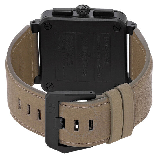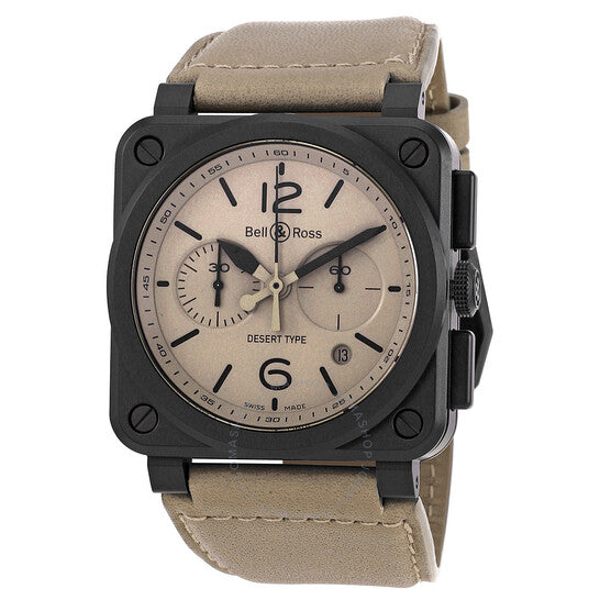 علبة سيراميك سوداء مع سوار من جلد العجل بيج. إطار ثابت من السيراميك الأسود. ميناء بيج مع عقارب سوداء وعلامات ساعات بأرقام عربية. علامات دقائق حول الحافة الخارجية. نوع الميناء: تناظري. عقارب وعلامات مضيئة. عرض التاريخ بين الساعة الرابعة والخامسة. كرونوغراف - ميناءان فرعيان يعرضان: ٦٠ ثانية و٣٠ دقيقة. حركة أوتوماتيكية من بيل آند روس، عيار BR-CAL.301، مبنية على ETA 2894-2، تحتوي على ٣٧ جوهرة، تنبض بتردد ٢٨٨٠٠ ذبذبة في الساعة، وتحتفظ باحتياطي طاقة يقارب ٤٢ ساعة. زجاج ياقوت مقاوم للخدش ومضاد للانعكاس. تاج قابل للسحب/الدفع. غطاء خلفي صلب. شكل العلبة مربع، أبعادها: ٤٢ مم × ٤٢ مم، سمكها: ١٢.٦ مم. مشبك بإبزيم تانغ. مقاومة للماء حتى عمق ١٠٠ متر / ٣٣٠ قدمًا. الوظائف: كرونوغراف، تاريخ، ساعات، دقائق، ثوانٍ صغيرة. سلسلة أجهزة القياس. طراز ساعة رياضية. ملصق الساعة: ساعة سويسرية آلية. ساعة بيل آند روس كرونوغراف أوتوماتيكية للرجال BR0394-DESERT-CE.