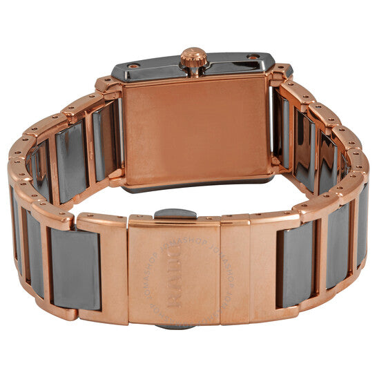 علبة سيراميك رمادية (عالية التقنية) مع سوار من الفولاذ المقاوم للصدأ مطلي بالذهب الوردي بتقنية PVD مع لمسات من السيراميك الرمادي (عالية التقنية). إطار ثابت من السيراميك الرمادي (عالي التقنية) مع لمسات من PVD بالذهب الوردي. ميناء أبيض اللون بعقارب بلون الذهب الوردي. مرصعة بالألماس عند مواضع الساعة 3 و6 و9 و12. نوع الميناء: تناظري. حركة كوارتز ETA عيار E61.111. زجاج من الياقوت المقاوم للخدش. تاج قابل للسحب/الدفع. غطاء خلفي صلب. شكل مستطيل. حجم العلبة: 22.7 مم. سمكها: 6.5 مم. مشبك قابل للطي بزر ضغط. مقاومة للماء حتى عمق 30 مترًا / 100 قدم. الوظائف: الساعات، الدقائق. سلسلة Integral Diamonds. طراز ساعة رسمية. علامة الساعة: صناعة سويسرية. ساعة رادو Integral Diamonds كوارتز نسائية بمينا بيضاء، R20141712.