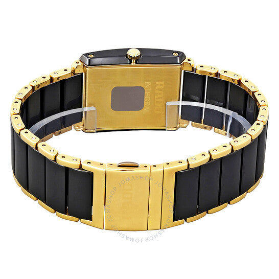 علبة من الفولاذ المقاوم للصدأ مطلية بالذهب الأصفر بتقنية PVD، مع سوار من الفولاذ المقاوم للصدأ مطلي بالذهب الأصفر بتقنية PVD، مع وصلة مركزية من السيراميك الأسود. إطار ثابت مطلي بالذهب الأصفر بتقنية PVD مع قضبان جانبية من السيراميك الأسود. ميناء أسود بعقارب ومؤشرات ساعات ذهبية اللون. نوع الميناء: تناظري. عرض التاريخ عند موضع الساعة السادسة. حركة كوارتز عيار ETA E61.111. زجاج ياقوتي مقاوم للخدش. تاج قابل للسحب/الدفع. غطاء خلفي صلب. شكل مستطيل. أبعاد الهيكل: 31 مم × 41 مم. سمك الهيكل: 7.5 مم. عرض السوار: 24 مم. مشبك قابل للطي. مقاومة للماء حتى عمق 50 مترًا / 165 قدمًا. الوظائف: التاريخ، الساعة، الدقيقة، الثانية. طراز ساعة رسمية. علامة الساعة: صناعة سويسرية. ساعة رادو إنتغرال إل للرجال بمينا أسود من السيراميك، R20968152.