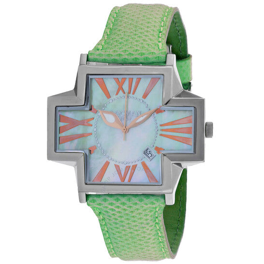 علبة فضية اللون من الفولاذ المقاوم للصدأ مع سوار جلدي أخضر. إطار ثابت من الفولاذ المقاوم للصدأ فضي اللون. ميناء من عرق اللؤلؤ مع عقارب ذهبية وردية وعلامات ساعات بأرقام رومانية. نوع الميناء: تناظري. عرض التاريخ بين موضعي الساعة 4 و5. آلية حركة كوارتز. زجاج معدني مقاوم للخدش. تاج قابل للسحب/الدفع. شكل علبة فريد، مقاس العلبة: 40 مم، سمكها: 8 مم. عرض السوار: 15 مم، طوله: 7.5 بوصة. مشبك بإبزيم. مقاومة للماء حتى عمق 50 مترًا / 165 قدمًا. الوظائف: التاريخ، الساعة، الدقائق، الثواني. سلسلة إيطاليا بلس. ساعة أنيقة. ساعة لوكمان إيطاليا بلس كوارتز نسائية 180MOPGR/GRKS.