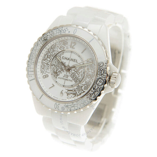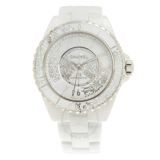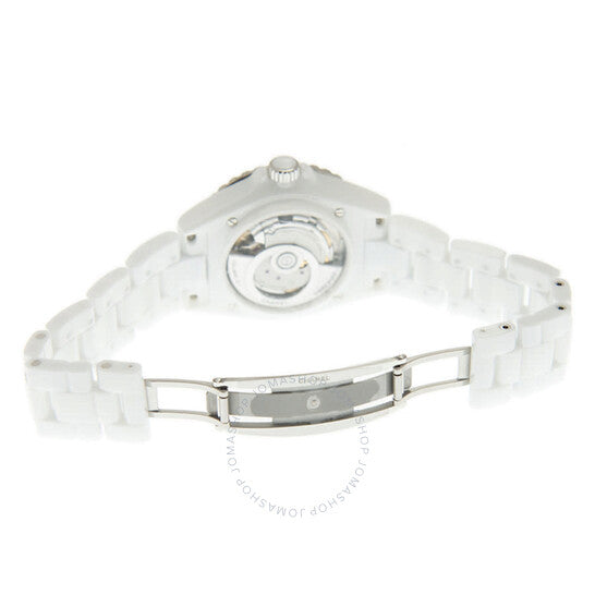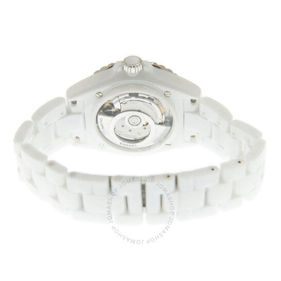 علبة وسوار من السيراميك الأبيض. إطار دوار أحادي الاتجاه من السيراميك. ميناء أبيض بأرقام عربية للساعات. نوع الميناء: تناظري. حركة أوتوماتيكية من كينيسي/شانيل، عيار 12.1، تحتوي على 28 جوهرة، تنبض بمعدل 28800 ذبذبة في الساعة، ولديها احتياطي طاقة يدوم حوالي 70 ساعة. زجاج من الياقوت المقاوم للخدش. تاج لولبي. غطاء خلفي شفاف. هيكل دائري الشكل، مقاسه 38 مم. مشبك قابل للطي. مقاومة للماء حتى عمق 200 متر / 660 قدم. الوظائف: الساعات، الدقائق، الثواني. سلسلة J12·20. تصميم ساعة فاخرة. علامة الساعة: صناعة سويسرية. ساعة شانيل J12·20 أوتوماتيكية نسائية بمينا أبيض، H6476.