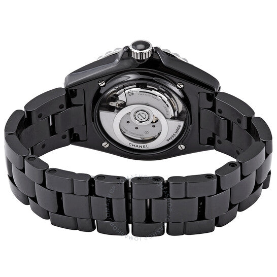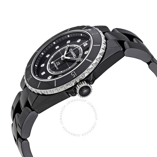 علبة وسوار من السيراميك الأسود (عالي المقاومة). إطار دوار أحادي الاتجاه من السيراميك الأسود (عالي المقاومة) مع حافة فولاذية. ميناء أسود بعقارب فضية اللون وعلامات ساعات من الماس. علامات دقائق حول الحافة الخارجية. نوع الميناء: تناظري. عرض التاريخ بين موضعي الساعة 4 و5. حركة شانيل أوتوماتيكية عيار 12.1. كريستال ياقوت مقاوم للخدش. تاج لولبي. غطاء خلفي شفاف. شكل دائري. حجم العلبة: 38 مم. سمكها: 12.6 مم. مشبك طي مخفي. مقاومة للماء حتى عمق 200 متر / 660 قدمًا. الوظائف: التاريخ، الساعة، الدقائق، الثواني. سلسلة J12. طراز ساعة رسمية. علامة الساعة: صناعة سويسرية. ساعة شانيل J12 أوتوماتيكية نسائية بمينا أسود مرصعة بالماس، طراز H5702.