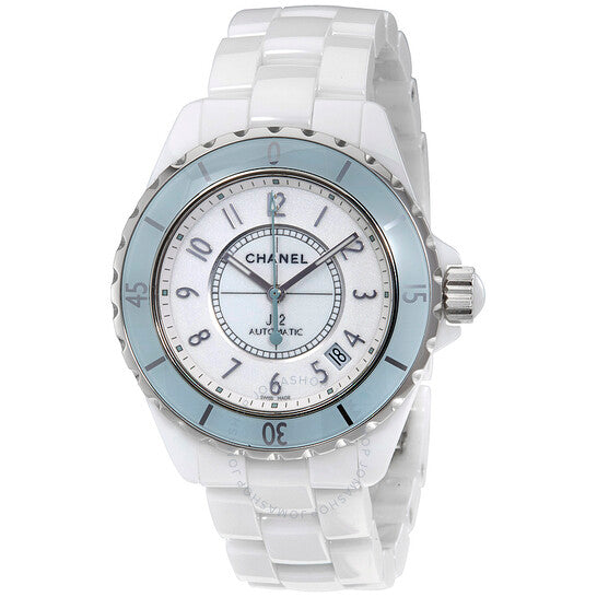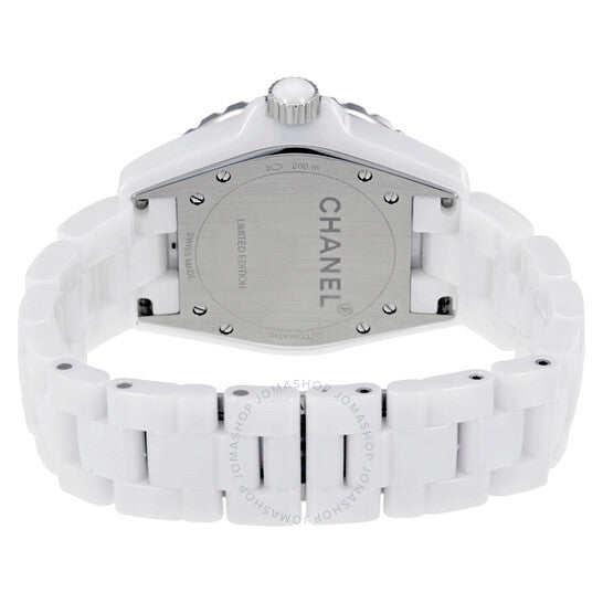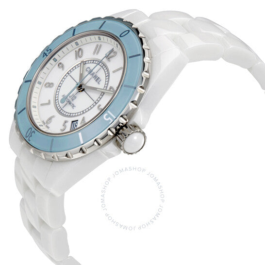 علبة من السيراميك الأبيض مع سوار من السيراميك الأبيض. إطار دوار أحادي الاتجاه من الفولاذ الأخضر الباستيل. ميناء أبيض بعقارب فضية مضيئة وعلامات ساعات عربية. علامات دقائق حول الحافة الخارجية. نوع الميناء: تناظري. عقارب مضيئة. عرض التاريخ بين موضعي الساعة 4 و5. حركة أوتوماتيكية مع احتياطي طاقة لمدة 42 ساعة. زجاج من الياقوت المقاوم للخدش. تاج لولبي. غطاء خلفي صلب. حجم العلبة: 38 مم. سمكها: 11 مم. شكلها دائري. مشبك مخفي قابل للطي. مقاومة للماء حتى عمق 200 متر / 660 قدم. الوظائف: التاريخ، الساعة، الدقائق، الثواني. معلومات إضافية: إصدار محدود من 1200 قطعة. طراز ساعة فاخرة. علامة الساعة: صناعة سويسرية. ساعة شانيل J12 أوتوماتيكية نسائية بمينا أبيض H4465.