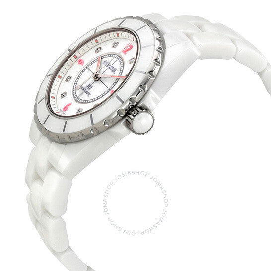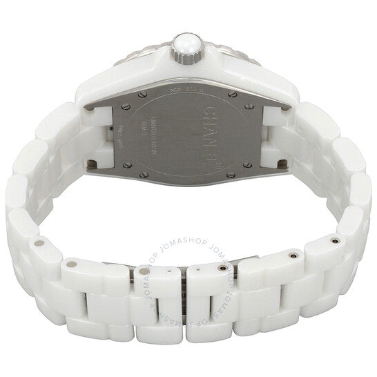 علبة من السيراميك الأبيض مع سوار من السيراميك الأبيض. إطار دوار أحادي الاتجاه من الفولاذ المقاوم للصدأ مع حلقة علوية من السيراميك الأبيض. ميناء أبيض مطلي بالورنيش مع عقارب فضية مضيئة وعلامات ساعات من الماس. أرقام عربية تُشير إلى مواقع الساعات 3 و6 و9 و12. علامات دقائق حول الحافة الخارجية. نوع الميناء: تناظري. عقارب وعلامات مضيئة. حركة أوتوماتيكية باحتياطي طاقة لمدة 42 ساعة. زجاج من الياقوت المقاوم للخدش. تاج لولبي. غطاء خلفي صلب. شكل دائري. حجم العلبة: 38 مم. سمكها: 11 مم. عرض السوار: 22 مم. مشبك قابل للطي. مقاومة للماء حتى عمق 200 متر / 660 قدمًا. الوظائف: الساعات، الدقائق، الثواني. معلومات إضافية: إصدار محدود من 1200 قطعة. تصميم ساعة فاخرة. علامة الساعة: صناعة سويسرية. ساعة شانيل J12 أوتوماتيكية نسائية بمينا أبيض H4864.