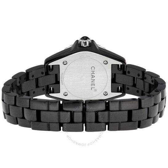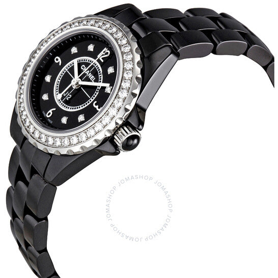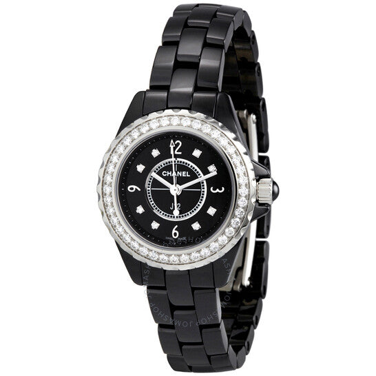 علبة من السيراميك الأسود مع سوار من السيراميك الأسود. إطار فضي أحادي الاتجاه مرصع بـ 40 ماسة. ميناء أسود بعقارب مضيئة وعلامات ساعات من الماس. أرقام عربية تُشير إلى الساعات 3 و6 و9 و12. علامات دقائق حول الحافة الخارجية. نوع الميناء: تناظري. حركة كوارتز. زجاج ياقوت مقاوم للخدش. تاج لولبي. غطاء خلفي صلب. قطر العلبة: 29 مم. سُمكها: 11 مم. مشبك طي مخفي. مقاومة للماء حتى عمق 200 متر/660 قدمًا. الوظائف: الساعات، الدقائق، الثواني. اسم الساعة: صناعة سويسرية. ساعة شانيل J12 كوارتز سيراميك سوداء نسائية H2571.