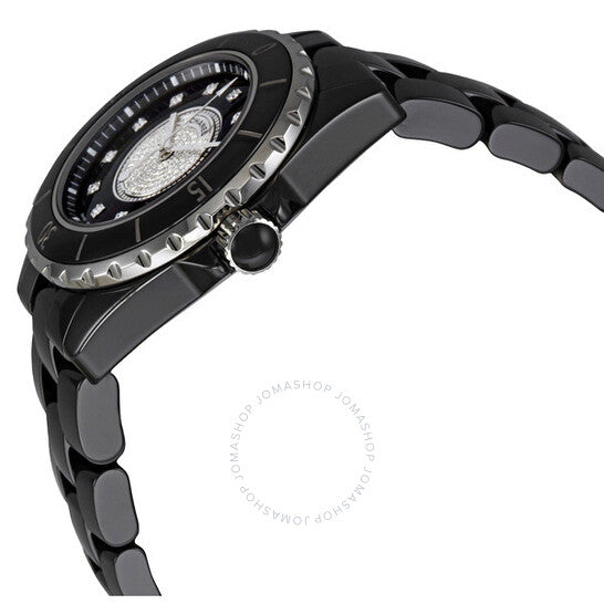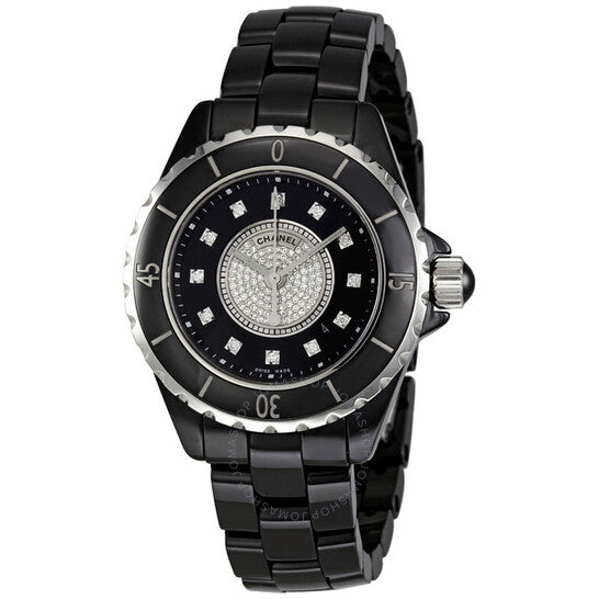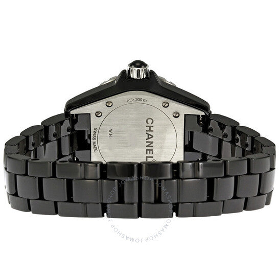 علبة من السيراميك الأسود مع سوار من السيراميك الأسود. إطار أحادي الاتجاه من الفولاذ المقاوم للصدأ مع حلقة علوية من السيراميك الأسود. ميناء أسود بمينا مركزي من الألماس، وعقارب مضيئة وعلامات ساعات من الألماس. علامات دقائق حول الحافة الخارجية. نوع الميناء: تناظري. عرض التاريخ بين موضعي الساعة الرابعة والخامسة. آلية حركة كوارتز. زجاج ياقوت مقاوم للخدش. تاج لولبي. غطاء خلفي صلب. شكل دائري. حجم العلبة: ٣٣ مم. سُمكها: ١٠ مم. مشبك مخفي قابل للطي. مقاومة للماء حتى عمق ٢٠٠ متر / ٦٦٠ قدمًا. الوظائف: الساعات، الدقائق، الثواني، التقويم. طراز ساعة رسمية. علامة الساعة: صناعة سويسرية. ساعة شانيل J12 نسائية بمينا أسود من السيراميك والألماس H2122.