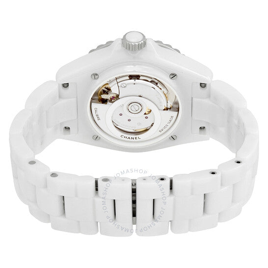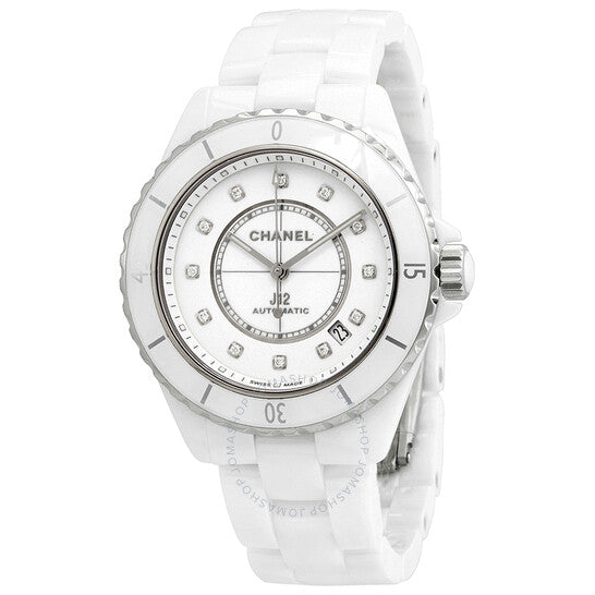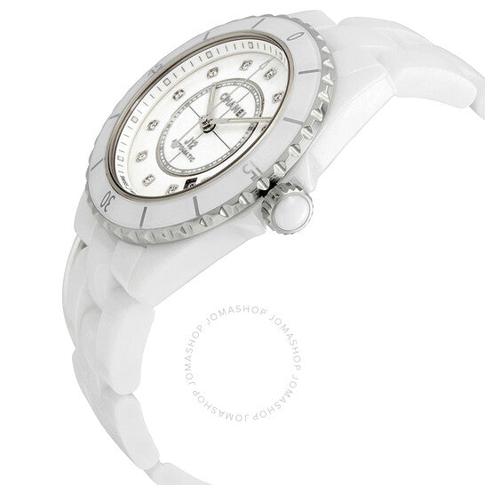 علبة من السيراميك الأبيض مع سوار من السيراميك الأبيض. إطار دوار أحادي الاتجاه من الفولاذ المقاوم للصدأ مُطعّم بالسيراميك الأبيض. ميناء أبيض بعقارب فضية مضيئة وعلامات ساعات من الألماس. علامات دقائق حول الحافة الخارجية. نوع الميناء: تناظري. عقارب وعلامات مضيئة. عرض التاريخ بين موضعي الساعة الرابعة والخامسة. حركة أوتوماتيكية من كينيسي/شانيل، عيار 12.1، تحتوي على 28 جوهرة، تنبض بمعدل 28800 ذبذبة في الساعة، ولديها احتياطي طاقة يصل إلى حوالي 70 ساعة. زجاج من الياقوت المقاوم للخدش. تاج لولبي. غطاء خلفي شفاف. شكل دائري. حجم العلبة: 38 مم. سمكها: 12.6 مم. مشبك قابل للطي. مقاومة للماء حتى عمق 200 متر / 660 قدم. الوظائف: التاريخ، الساعة، الدقائق، الثواني، الكرونومتر. طراز ساعة فاخرة. علامة الساعة: صناعة سويسرية. ساعة شانيل J12 نسائية مرصعة بالألماس بمينا بيضاء H5705.