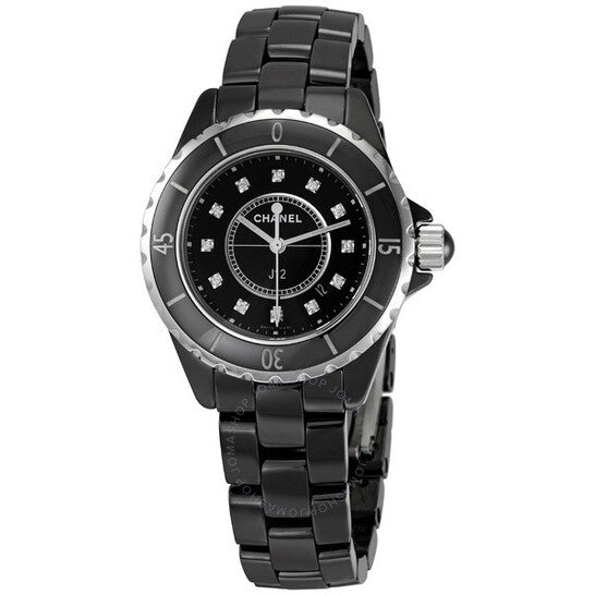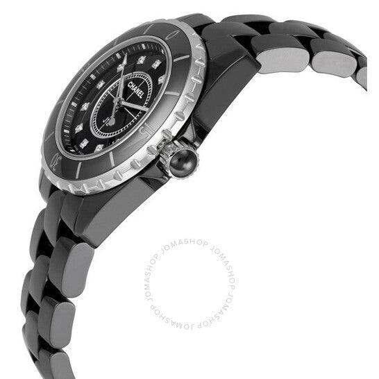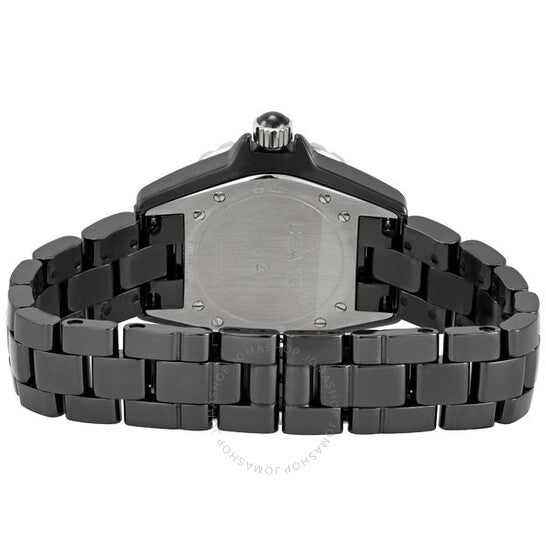 علبة من السيراميك الأسود مطلية بكربيد التنغستن الأسود، مع سوار من السيراميك الأسود. إطار دوار ثنائي الاتجاه من الفولاذ المقاوم للصدأ مرصع بالسيراميك الأسود. ميناء أسود بعقارب مضيئة وعلامات ساعات من الماس. علامات دقائق حول الحافة الخارجية. نوع الميناء: تناظري. عقارب مضيئة. عرض التاريخ بين موضعي الساعة الرابعة والخامسة. آلية حركة كوارتز. زجاج ياقوت مقاوم للخدش. تاج لولبي. غطاء خلفي صلب. شكل دائري. حجم العلبة: ٣٣ مم. سمكها: ٩ مم. عرض السوار: ١٦ مم. طول السوار: ٧ بوصات. مشبك قابل للطي مخفي. مقاومة للماء حتى عمق ٢٠٠ متر / ٦٦٠ قدمًا. الوظائف: الساعات، الدقائق، الثواني، التاريخ. طراز الساعة الرياضية. علامة الساعة: صناعة سويسرية. ساعة شانيل J12 نسائية من السيراميك الأسود مرصعة بالماس H1625.
