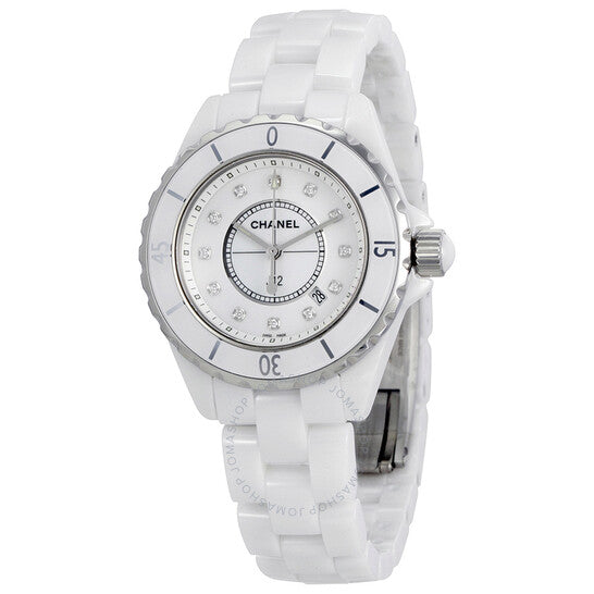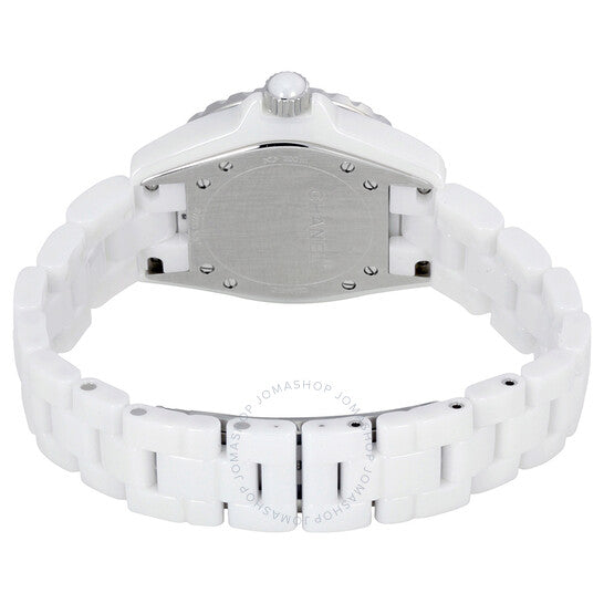 علبة من السيراميك الأبيض مع سوار من السيراميك الأبيض. إطار فولاذي دوار أحادي الاتجاه مُطعّم بالسيراميك الأبيض. ميناء أبيض بعقارب مضيئة وعلامات ساعات من الألماس. علامات دقائق حول الحافة الخارجية. نوع الميناء: تناظري. عقارب مضيئة. عرض التاريخ بين موضعي الساعة الرابعة والخامسة. حركة كوارتز. زجاج ياقوت مقاوم للخدش. تاج لولبي. غطاء خلفي صلب. قطر العلبة: ٣٣ مم. سُمكها: ١١ مم. طول السوار: ٧ بوصات. مشبك مخفي قابل للطي. مقاومة للماء حتى عمق ٢٠٠ متر / ٦٦٠ قدمًا. الوظائف: الساعات، الدقائق، الثواني، التاريخ. طراز ساعة رياضية فاخرة. علامة الساعة: صناعة سويسرية. ساعة شانيل H1628 J12 نسائية مرصعة بالألماس.