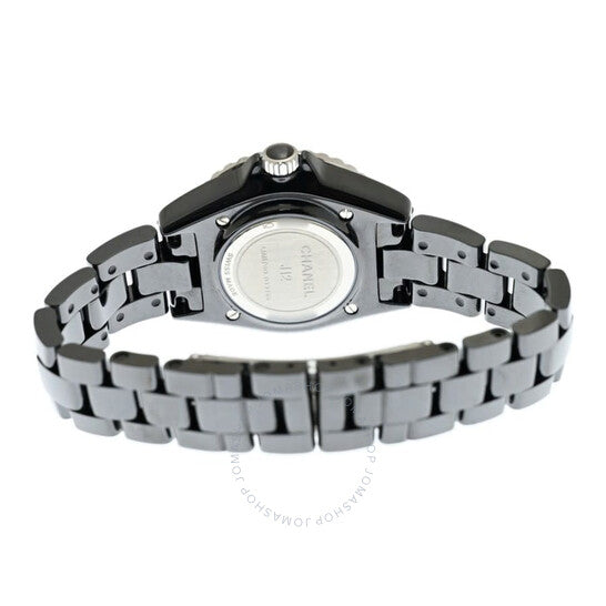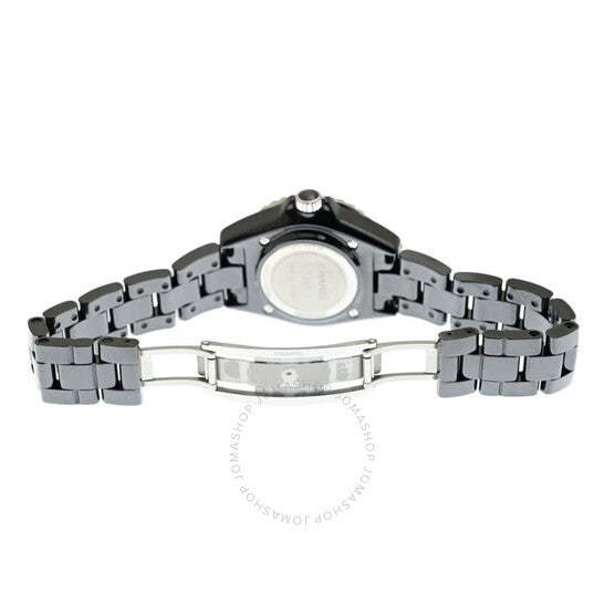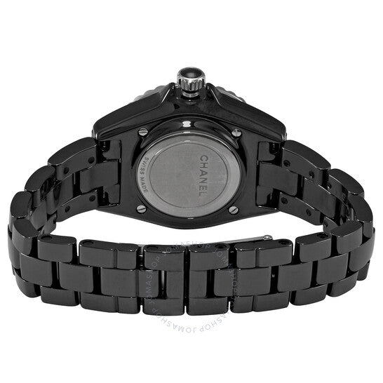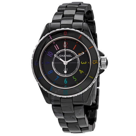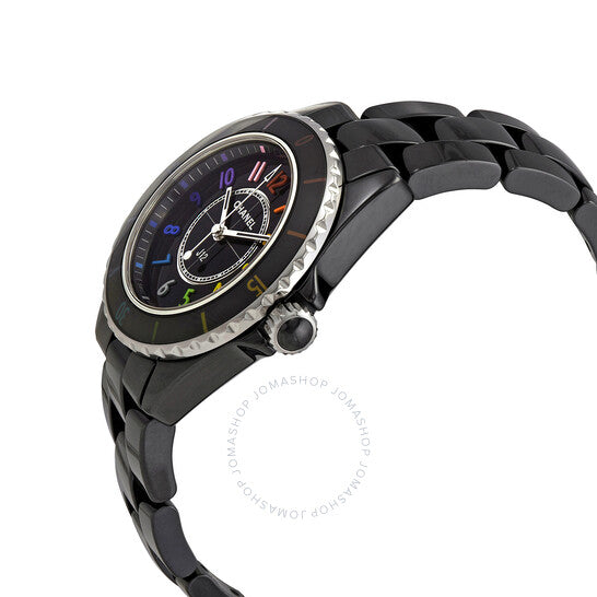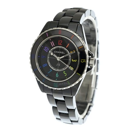 علبة من السيراميك الأسود مع سوار من السيراميك الأسود. إطار دوار أحادي الاتجاه من الفولاذ المقاوم للصدأ مع حلقة من السيراميك الأسود المرصع. ميناء أسود مطلي بالورنيش مع عقارب سوداء وعلامات ساعات بأرقام عربية (نيون). مقياس دقائق حول حلقة داخلية. نوع الميناء: تناظري. عقارب مضيئة. آلية حركة كوارتز. زجاج من الياقوت المقاوم للخدش. تاج لولبي. غطاء خلفي صلب. شكل دائري. حجم العلبة: 33 مم. سمكها: 12.94 مم. مشبك مخفي قابل للطي. مقاومة للماء حتى عمق 200 متر / 660 قدمًا. الوظائف: الساعات، الدقائق، الثواني. معلومات إضافية: العلبة الأصلية، دليل الاستخدام (ملحقات كاملة). سلسلة J12 إلكترو. تصميم ساعة فاخر. علامة الساعة: صناعة سويسرية. ساعة شانيل J12 إلكترو كوارتز نسائية بمينا سوداء H7121.