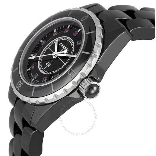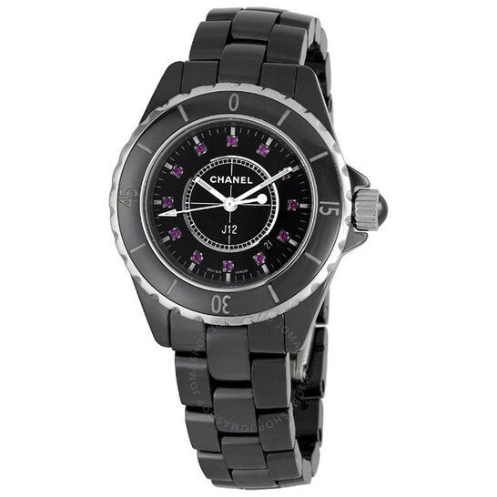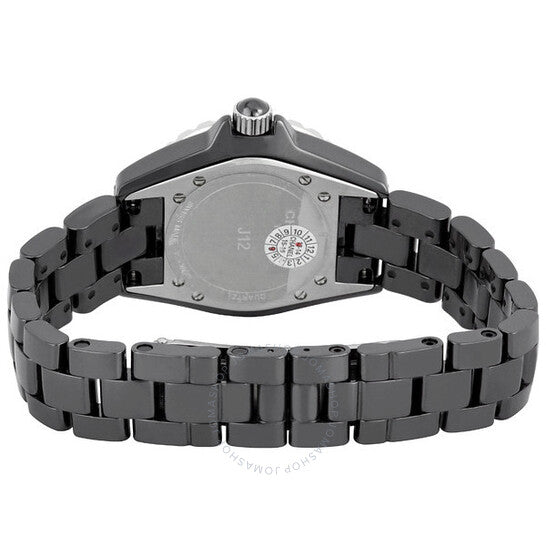 علبة من السيراميك الأسود مع سوار من السيراميك الأسود. إطار أسود أحادي الاتجاه. ميناء أسود بمؤشرات من الياقوت، وعقارب مضيئة وعلامات ساعات من الياقوت. علامات دقائق حول الحافة الخارجية. عقارب مضيئة. نافذة عرض التاريخ بين موضعي الساعة الرابعة والخامسة. حركة كوارتز. زجاج ياقوت مقاوم للخدش. قطر العلبة: 33 مم. مشبك مخفي. مقاومة للماء حتى عمق 200 متر / 660 قدمًا. الوظائف: الساعات، الدقائق، الثواني، التاريخ. ساعة شانيل J12 النسائية H1634.