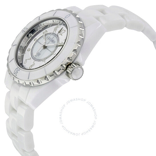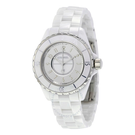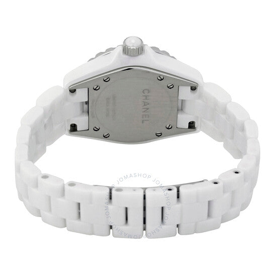 علبة وسوار من السيراميك الأبيض عالي التقنية. إطار دوار أحادي الاتجاه من الفولاذ المقاوم للصدأ مع حلقة علوية من السيراميك الأبيض. ميناء فضي بعقارب بيضاء مضيئة وعلامات ساعات بأرقام عربية. علامات دقائق حول الحافة الخارجية. نوع الميناء: تناظري. عقارب وعلامات مضيئة. حركة كوارتز. زجاج ياقوت مقاوم للخدش. تاج لولبي. غطاء خلفي صلب. حجم العلبة: 33 مم. سمكها: 11 مم. شكلها دائري. مشبك مخفي قابل للطي. مقاومة للماء حتى عمق 200 متر / 660 قدمًا. وظائفها: الساعات، الدقائق، الثواني. معلومات إضافية: إصدار محدود من 1200 قطعة. تصميم ساعة فاخرة. علامة الساعة: صناعة سويسرية. ساعة شانيل J12 نسائية H4861.