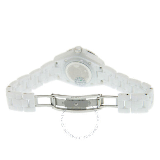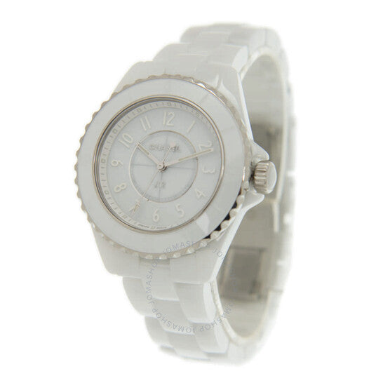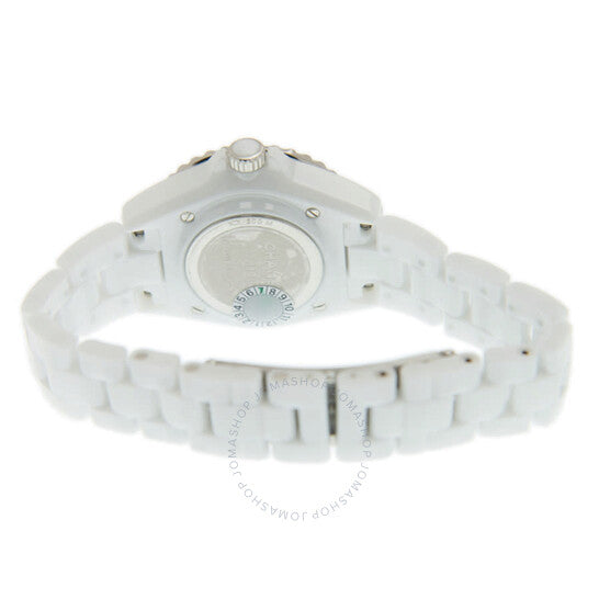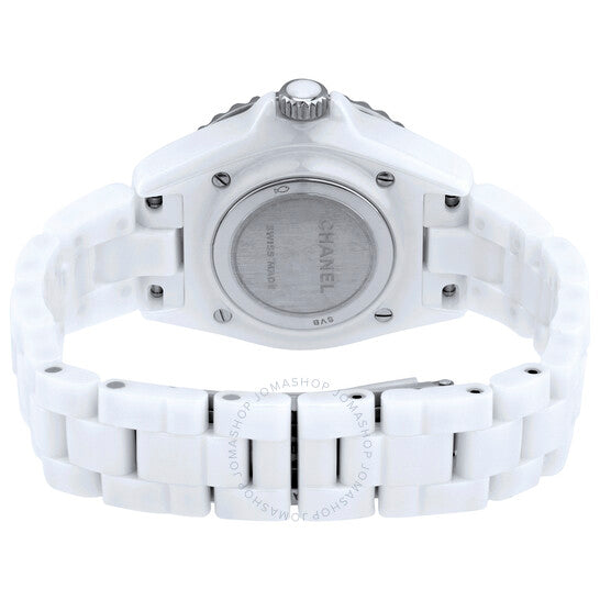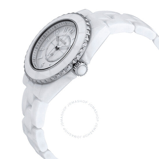 علبة من السيراميك الأبيض مع سوار من السيراميك الأبيض. إطار دوار أحادي الاتجاه من الفولاذ المقاوم للصدأ مع حلقة من السيراميك الأبيض. ميناء أبيض بعقارب فضية مضيئة وعلامات ساعات بأرقام عربية. علامات دقائق حول الحافة الخارجية. نوع الميناء: تناظري. عقارب مضيئة. آلية حركة كوارتز. زجاج ياقوت مقاوم للخدش. تاج لولبي مرصع بقطعة كابوشون من السيراميك الأبيض. غطاء خلفي صلب. شكل دائري. حجم العلبة: 33 مم. سمكها: 12.94 مم. مشبك قابل للطي. مقاومة للماء حتى عمق 200 متر / 660 قدمًا. الوظائف: الساعات، الدقائق، الثواني. معلومات إضافية: العلبة الأصلية، بطاقة الضمان الدولية، دليل الاستخدام (ملحقات كاملة). سلسلة J12. تصميم ساعة فاخرة. ملصق الساعة: صناعة سويسرية. ساعة شانيل J12 فانتوم نسائية بمينا بيضاء H6345.