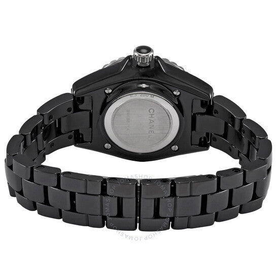 علبة من السيراميك الأسود مع سوار من السيراميك الأسود. إطار دوار أحادي الاتجاه من الفولاذ المقاوم للصدأ مع حلقة من السيراميك الأسود. ميناء أسود بعقارب فضية مضيئة وعلامات ساعات من الألماس. علامات دقائق حول الحافة الخارجية. نوع الميناء: تناظري. عقارب مضيئة. آلية حركة كوارتز. زجاج ياقوت مقاوم للخدش. تاج لولبي. غطاء خلفي صلب. شكل دائري. حجم العلبة: 33 مم. سمكها: 12.94 مم. مشبك مخفي قابل للطي. مقاومة للماء حتى عمق 200 متر / 660 قدمًا. الوظائف: الساعات، الدقائق، الثواني. معلومات إضافية: العلبة الأصلية، دليل الاستخدام (ملحقات كاملة). سلسلة J12. تصميم ساعة فاخرة. علامة الساعة: صناعة سويسرية. ساعة شانيل J12 كوارتز نسائية بمينا أسود مرصعة بالألماس H5701.
