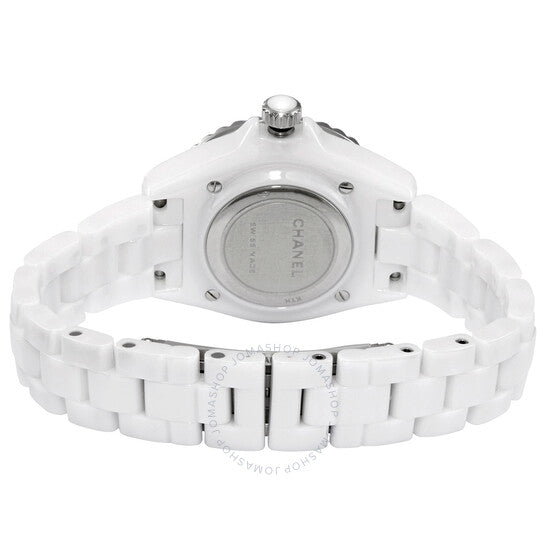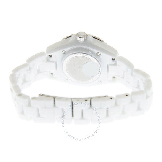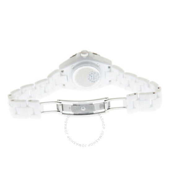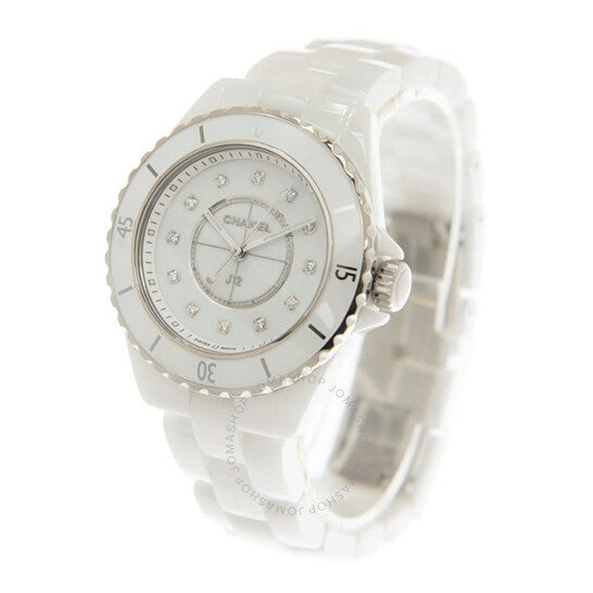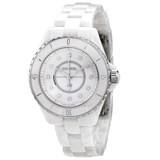 علبة من السيراميك الأبيض مع سوار من السيراميك الأبيض. إطار دوار أحادي الاتجاه من الفولاذ المقاوم للصدأ مُطعّم بالسيراميك الأبيض. ميناء أبيض بعقارب فضية اللون وعلامات ساعات من الألماس. علامات دقائق حول الحافة الخارجية. نوع الميناء: تناظري. عقارب مضيئة. آلية حركة كوارتز. زجاج ياقوتي مقاوم للخدش. تاج لولبي. غطاء خلفي صلب. شكل دائري. حجم العلبة: 33 مم. سُمكها: 12.94 مم. مشبك مخفي قابل للطي. مقاومة للماء حتى عمق 200 متر / 660 قدمًا. الوظائف: الساعات، الدقائق، الثواني. سلسلة J12. تصميم ساعة فاخرة. علامة الساعة: صناعة سويسرية. ساعة شانيل J12 كوارتز نسائية بمينا بيضاء مرصعة بالألماس H5703.