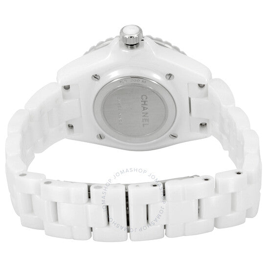 علبة وسوار من السيراميك الأبيض. إطار ثابت من الفولاذ المقاوم للصدأ الأبيض مع حلقة من السيراميك الأبيض المرصع. ميناء أبيض من عرق اللؤلؤ مع عقارب فضية مضيئة وعلامات ساعات من الماس. تظهر الأرقام العربية عند مواضع الساعات 3 و6 و9 و12. علامات الدقائق حول الحافة الخارجية. نوع الميناء: تناظري. عقارب مضيئة. حركة كوارتز. زجاج ياقوت مقاوم للخدش. تاج لولبي. غطاء خلفي صلب. شكل دائري. حجم العلبة: 33 مم. سمكها: 12.94 مم. مشبك مخفي قابل للطي. مقاومة للماء حتى عمق 200 متر / 660 قدمًا. الوظائف: الساعات، الدقائق، الثواني. معلومات إضافية: العلبة الأصلية، دليل الاستخدام (ملحقات كاملة). سلسلة J12. تصميم ساعة فاخرة. علامة الساعة: صناعة سويسرية. ساعة شانيل J12 كوارتز نسائية بمينا بيضاء مرصعة بالألماس H5704.