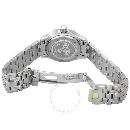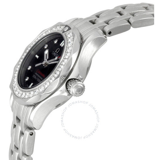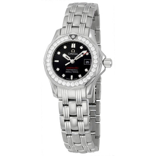 علبة من الفولاذ المقاوم للصدأ فضية اللون مع سوار فضي اللون. إطار دوار أحادي الاتجاه مرصع بالألماس فضي اللون. ميناء أسود بعقارب هيكلية وعلامات ساعات من الألماس. علامات دقائق حول الحافة الخارجية. نوع الميناء: تناظري. عقارب مضيئة. عرض التاريخ عند موضع الساعة 3. حركة كوارتز أوميغا كاليبر 1424. كريستال ياقوت مقاوم للخدش. تاج لولبي. غطاء خلفي صلب. شكل دائري، مقاس العلبة: 28 مم، سمكها: 10 مم. قابلة للطي بمشبك بزر ضغط. مقاومة للماء حتى عمق 300 متر / 1000 قدم. الوظائف: التاريخ، الساعات، الدقائق، الثواني، مؤشر عمر البطارية، الكرونومتر. سلسلة سيماستر. طراز ساعة رسمية. علامة الساعة: صناعة سويسرية. إصدارات المنتج: 212.15.28.61.51.001، 212.15.28.61.51.001، 21215286151001، 212.15.28.61.51. ساعة أوميغا جيمس بوند سيماستر 300 متر للسيدات مرصعة بالألماس، 212.15.28.61.51.001.