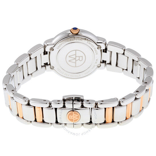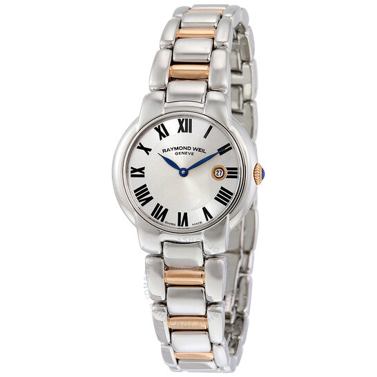 علبة من الفولاذ المقاوم للصدأ مع سوار من الفولاذ المقاوم للصدأ ثنائي اللون (فضي وذهبي وردي مطلي بتقنية الترسيب الفيزيائي للبخار). إطار ثابت من الفولاذ المقاوم للصدأ. ميناء فضي بعقارب زرقاء وعلامات ساعات بأرقام رومانية. نوع الميناء: تناظري. عرض التاريخ عند موضع الساعة 3. آلية حركة كوارتز. زجاج ياقوت مقاوم للخدش. تاج قابل للسحب/الدفع. غطاء خلفي صلب. قطر العلبة: 29 مم. سُمكها: 7.5 مم. شكلها دائري. عرض السوار: 17.8 مم. طول السوار: 7 بوصات. مشبك قابل للطي بزر ضغط. مقاومة للماء حتى عمق 50 مترًا / 165 قدمًا. الوظائف: التاريخ، الساعة، الدقيقة، الثانية. تصميم ساعة فاخرة. علامة الساعة: صناعة سويسرية. ساعة ريموند ويل جاسمين النسائية بمينا فضي وثنائية اللون من الفولاذ المقاوم للصدأ، رقمها 5229-S5-01659.