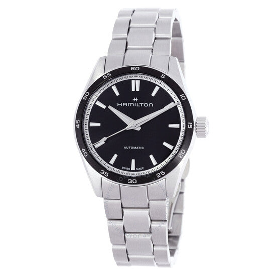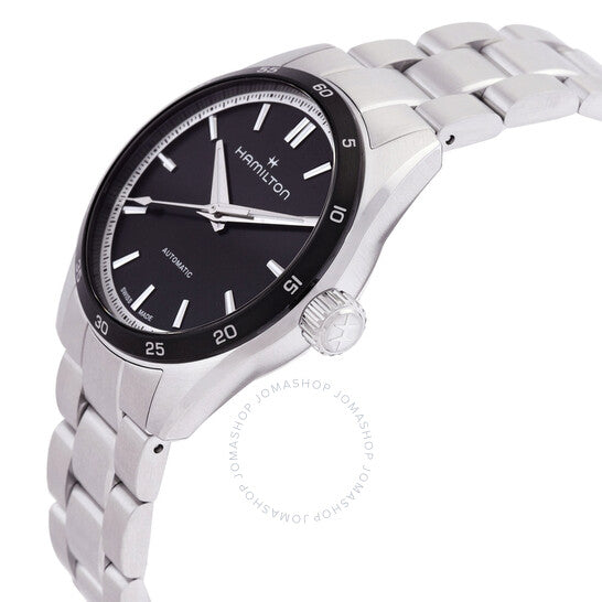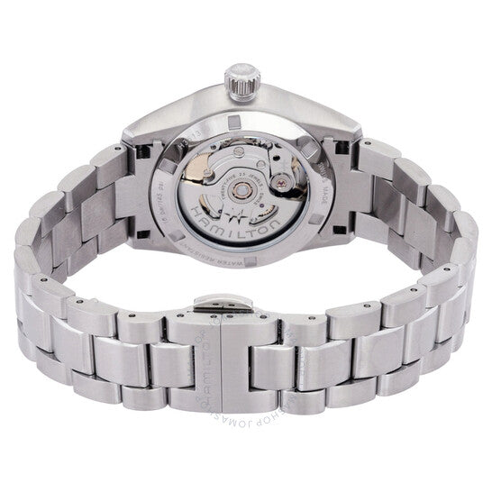 علبة وسوار من الفولاذ المقاوم للصدأ فضي اللون. إطار ثابت من الفولاذ المقاوم للصدأ أسود اللون. ميناء أسود بعقارب فضية اللون وعلامات ساعات. علامات دقائق حول الحافة الخارجية. نوع الميناء: تناظري. حركة هاميلتون كاليبر H-10 أوتوماتيكية، مبنية على ETA C07.111، تحتوي على 25 جوهرة، تنبض بمعدل 21600 ذبذبة في الساعة، ولديها احتياطي طاقة يدوم حوالي 80 ساعة. زجاج من الياقوت المقاوم للخدش. تاج لولبي. غطاء خلفي شفاف. شكل العلبة دائري، مقاسها: 34 مم. عرض السوار: 18 مم. مشبك فراشة. مقاومة للماء حتى عمق 100 متر / 330 قدمًا. الوظائف: الساعات، الدقائق، الثواني. سلسلة جازماستر. تصميم كاجوال. علامة الساعة: صناعة سويسرية. ساعة هاميلتون جازماستر أوتوماتيكية نسائية بمينا سوداء H36135130.