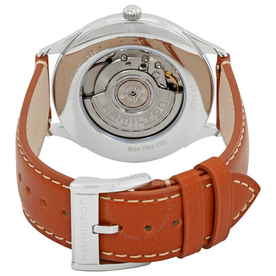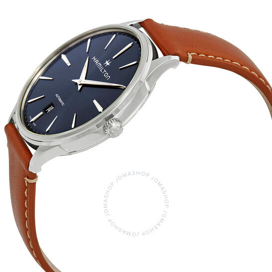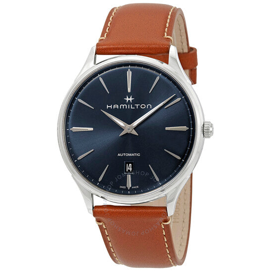 علبة من الفولاذ المقاوم للصدأ مع سوار جلدي بني. إطار ثابت من الفولاذ المقاوم للصدأ. ميناء أزرق مع عقارب ومؤشرات ساعات فضية مضيئة على شكل دوفين. علامات دقائق حول الحافة الخارجية. نوع الميناء: تناظري. عقارب ومؤشرات مضيئة. عرض التاريخ فوق موضع الساعة السادسة. حركة أوتوماتيكية عيار ETA 2892-A2، مبنية على ETA 2890، تحتوي على 21 جوهرة، تنبض بمعدل 28800 ذبذبة في الساعة، ولديها احتياطي طاقة لمدة 42 ساعة تقريبًا. زجاج ياقوت مقاوم للخدش. تاج قابل للسحب/الدفع. غطاء خلفي شفاف. شكل دائري. حجم العلبة: 40 مم. سمك العلبة: 8.8 مم. عرض السوار: 20 مم. مشبك تانغ. مقاومة للماء حتى عمق 50 مترًا / 165 قدمًا. الوظائف: التاريخ، الساعة، الدقائق. طراز ساعة رسمية. ملصق الساعة: صناعة سويسرية. ساعة هاميلتون جازماستر أوتوماتيكية للرجال بمينا زرقاء H38525541.