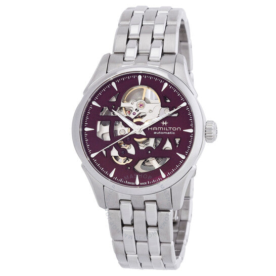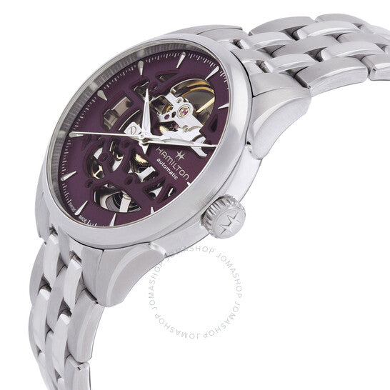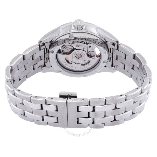 علبة وسوار من الفولاذ المقاوم للصدأ فضي اللون. إطار ثابت من الفولاذ المقاوم للصدأ فضي اللون. ميناء بنفسجي مع عقارب فضية اللون وعلامات ساعات. علامات دقائق حول الحافة الخارجية. نوع الميناء: تناظري. عقارب مضيئة. حركة هاميلتون كاليبر H-10-S أوتوماتيكية، مبنية على ETA C07.111، تحتوي على 25 جوهرة، تنبض بسرعة 21600 ذبذبة في الساعة، ولديها احتياطي طاقة يدوم حوالي 80 ساعة. زجاج من الياقوت المقاوم للخدش. غطاء خلفي شفاف. شكل العلبة دائري، مقاسها: 36 مم، سمكها: 10.55 مم. عرض السوار: 18 مم. مشبك فراشة. مقاومة للماء حتى عمق 50 مترًا / 165 قدمًا. الوظائف: الساعات، الدقائق، الثواني. سلسلة جازماستر. علامة الساعة: صناعة سويسرية. ساعة هاميلتون جازماستر أوتوماتيكية نسائية بمينا بنفسجي H32265101.
