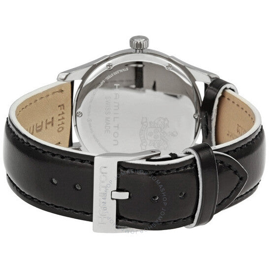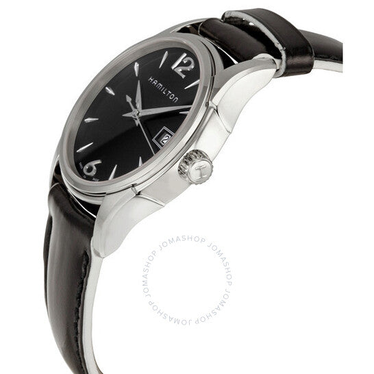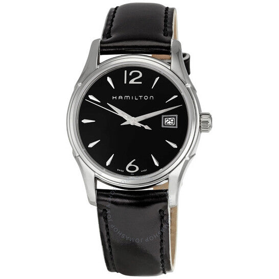 علبة من الفولاذ المقاوم للصدأ مع سوار جلدي أسود. إطار ثابت من الفولاذ المقاوم للصدأ. ميناء أسود بعقارب فضية مضيئة ومؤشرات ساعات. أرقام عربية تُشير إلى موضعي الساعة 6 و12. نوع الميناء: تناظري. عقارب مضيئة. عرض التاريخ عند موضع الساعة 3. آلية حركة كوارتز. زجاج معدني مقاوم للخدش. تاج لولبي. غطاء خلفي صلب. شكل دائري. حجم العلبة: 34 مم. سمكها: 12 مم. عرض السوار: 18 مم. طول السوار: 7 بوصات. مشبك تانغ. مقاومة للماء حتى عمق 50 مترًا / 165 قدمًا. الوظائف: الساعات، الدقائق، الثواني، التقويم. تصميم كاجوال. علامة الساعة: صناعة سويسرية. ساعة هاميلتون جازماستر نسائية بمينا سوداء H32351735.