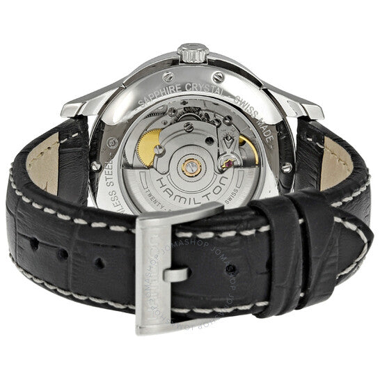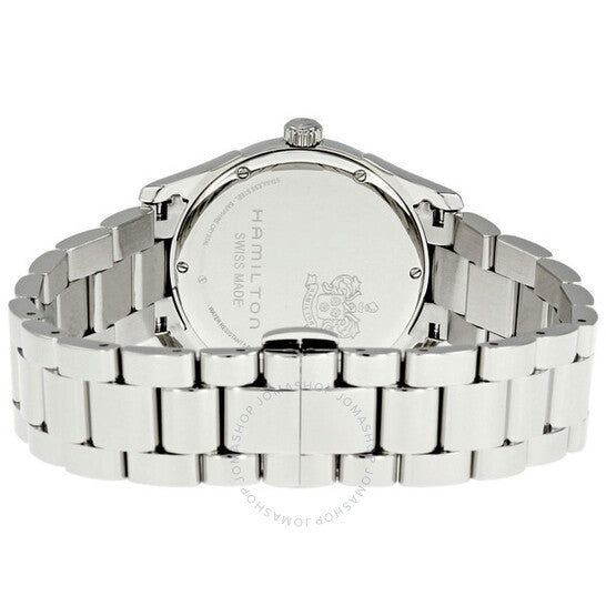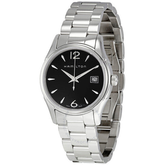 علبة من الفولاذ المقاوم للصدأ مع سوار من الفولاذ المقاوم للصدأ. إطار ثابت من الفولاذ المقاوم للصدأ. ميناء أسود بعقارب فضية اللون ومؤشرات ساعات. أرقام عربية تُشير إلى موضعي الساعة 6 و12. نوع الميناء: تناظري. عقارب مضيئة. عرض التاريخ عند موضع الساعة 3. حركة كوارتز من عيار F05.111. زجاج ياقوتي مقاوم للخدش. غطاء خلفي صلب. حجم العلبة: 34 مم. سُمكها: 8 مم. شكلها دائري. عرض السوار: 16 مم. مشبك قابل للطي. مقاومة للماء حتى عمق 50 مترًا / 165 قدمًا. الوظائف: التاريخ، الساعة، الدقائق، الثواني، مؤشر عمر البطارية. تصميم كاجوال. علامة الساعة: صناعة سويسرية. ساعة هاميلتون جازماستر نسائية بمينا أسود من الفولاذ المقاوم للصدأ، طراز H32351135.