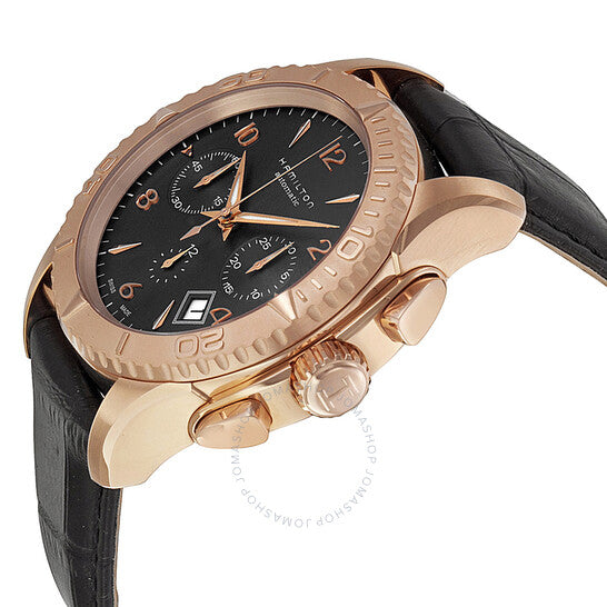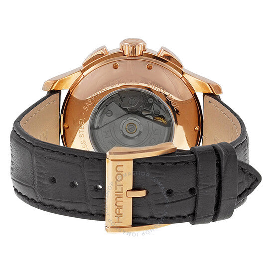 علبة من الفولاذ المقاوم للصدأ مطلية بالذهب مع حزام جلدي. إطار دوار أحادي الاتجاه. ميناء بني مع عقارب بلون الذهب الوردي وأرقام عربية وعلامات ساعات متناوبة. علامات دقائق حول الحافة الخارجية. نوع الميناء: تناظري. يظهر عرض التاريخ بين موضعي الساعة 4 و5. كرونوغراف - ثلاثة أقراص فرعية تعرض: 60 ثانية، 30 دقيقة، و12 ساعة. حركة أوتوماتيكية. قطر العلبة: 44 مم. شكل العلبة دائري. الوظائف: كرونوغراف، تاريخ، ساعة، دقيقة، ثانية. طراز ساعة فاخرة. علامة الساعة: صناعة سويسرية. ساعة هاميلتون JKazzmaster رجالية بمينا بني وسوار جلدي، H37646795.