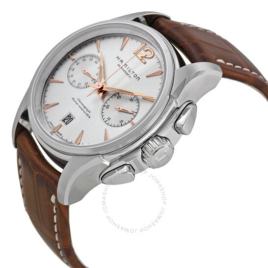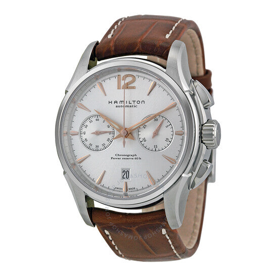 علبة فضية اللون من الفولاذ المقاوم للصدأ مع سوار جلدي بني. إطار ثابت من الفولاذ المقاوم للصدأ فضي اللون. ميناء فضي مع عقارب وعلامات ساعات ذهبية وردية اللون. أرقام عربية تشير إلى موضع الساعة ١٢. علامات دقائق حول الحافة الخارجية. نوع الميناء: تناظري. عقارب وعلامات مضيئة. عرض التاريخ عند موضع الساعة ٦. كرونوغراف - ميناءان فرعيان يعرضان: ٣٠ دقيقة و٦٠ ثانية. حركة هاميلتون كاليبر H-31 أوتوماتيكية، مبنية على ETA 7753، تحتوي على ٢٧ جوهرة، تنبض بمعدل ٢٨٨٠٠ ذبذبة في الساعة، ولديها احتياطي طاقة لمدة ٦٠ ساعة تقريبًا. زجاج ياقوت مقاوم للخدش. تاج لولبي. ظهر هيكل هيكلي. شكل دائري، حجم العلبة: ٤٢ مم، سمكها: ١٥ مم. عرض السوار: ٢٠ مم، طوله: ٧ بوصات. مشبك تانغ. مقاومة للماء حتى عمق ١٠٠ متر / ٣٣٠ قدمًا. الوظائف: كرونوغراف، تاريخ، ساعات، دقائق، ثوانٍ. سلسلة جازماستر. طراز ساعة رسمية. علامة الساعة: صناعة سويسرية. ساعة هاميلتون جازماستر كرونوغراف للرجال بمينا فضي، طراز H32606555.