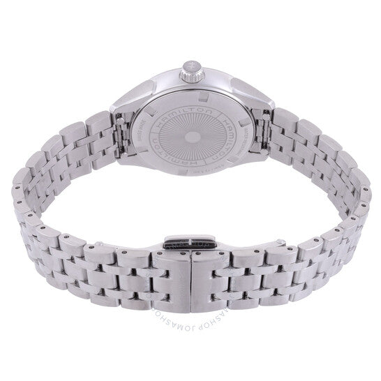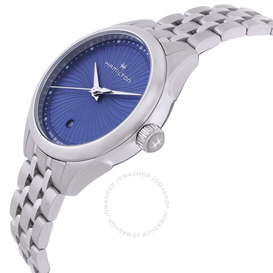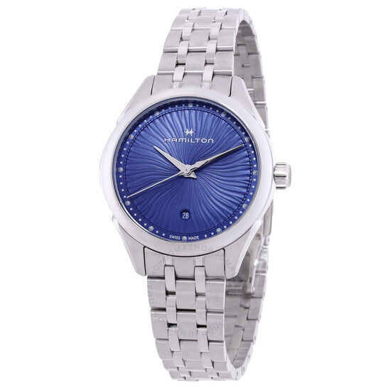 علبة وسوار من الفولاذ المقاوم للصدأ فضي اللون. إطار ثابت من الفولاذ المقاوم للصدأ فضي اللون. ميناء أزرق بعقارب فضية اللون وعلامات ساعات منقطة. نوع الميناء: تناظري. عرض التاريخ عند موضع الساعة السادسة. حركة كوارتز عيار F04.115. زجاج ياقوت مقاوم للخدش. تاج قابل للسحب/الدفع. غطاء خلفي صلب. شكل دائري، مقاس العلبة: 30 مم، سمكها: 8 مم. عرض السوار: 14 مم. مشبك فراشة. مقاومة للماء حتى عمق 50 مترًا / 165 قدمًا. الوظائف: التاريخ، الساعة، الدقائق، الثانية. سلسلة جازماستر ليدي كوارتز. تصميم كاجوال. علامة الساعة: صناعة سويسرية. ساعة هاميلتون جازماستر ليدي كوارتز نسائية بمينا زرقاء H32231140.