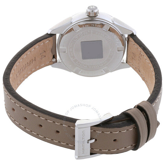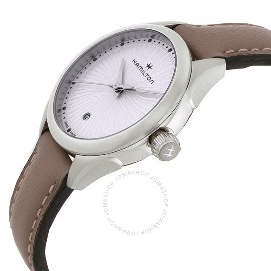 علبة من الفولاذ المقاوم للصدأ فضية اللون مع سوار جلدي بني. إطار ثابت من الفولاذ المقاوم للصدأ فضي اللون. ميناء أبيض بعقارب فضية اللون وعلامات ساعات. علامات دقائق حول الحافة الخارجية. نوع الميناء: تناظري. عرض التاريخ عند موضع الساعة السادسة. حركة كوارتز عيار F04.115. زجاج ياقوتي مقاوم للخدش. تاج قابل للسحب/الدفع. غطاء خلفي صلب. شكل دائري، مقاس العلبة: 30 مم، سمكها: 8 مم. عرض السوار: 12 مم. مشبك بإبزيم. مقاومة للماء حتى عمق 50 مترًا / 165 قدمًا. الوظائف: التاريخ، الساعة، الدقائق، الثواني. سلسلة ساعات جازماستر ليدي كوارتز. طراز ساعة رسمية. علامة الساعة: صناعة سويسرية. ساعة هاميلتون جازماستر ليدي كوارتز نسائية بمينا بيضاء H32231810.