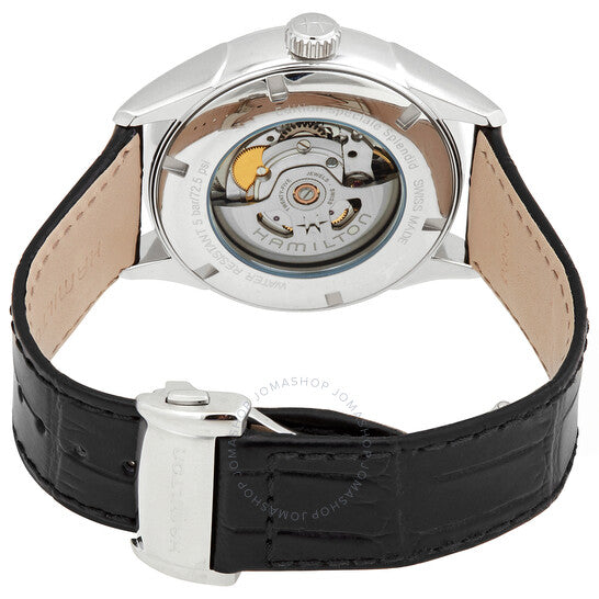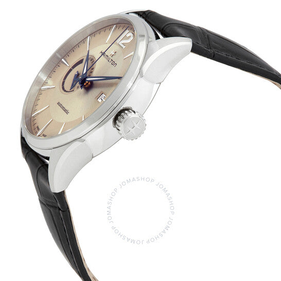 علبة فضية اللون من الفولاذ المقاوم للصدأ مع سوار أسود من جلد العجل. إطار ثابت فضي اللون من الفولاذ المقاوم للصدأ. ميناء بيج بعقارب زرقاء ومؤشر عربي عند علامات الساعة ١٢. نوع الميناء: تناظري. عرض التاريخ عند موضع الساعة ٣. موانئ فرعية باحتياطي طاقة واحد. حركة هاميلتون كاليبر H-13 أوتوماتيكية باحتياطي طاقة يصل إلى ٨٠ ساعة. زجاج من الياقوت المقاوم للخدش. علبة دائرية الشكل، مقاسها ٤٢ مم. مشبك قابل للطي. مقاومة للماء حتى عمق ٥٠ مترًا / ١٦٥ قدمًا. الوظائف: التاريخ، الساعة، الدقيقة، الثانية، احتياطي الطاقة. سلسلة جازماستر باور ريزيرف. طراز ساعة رسمية. علامة الساعة: صناعة سويسرية. ساعة هاميلتون جازماستر باور ريزيرف أوتوماتيكية للرجال H89545721.