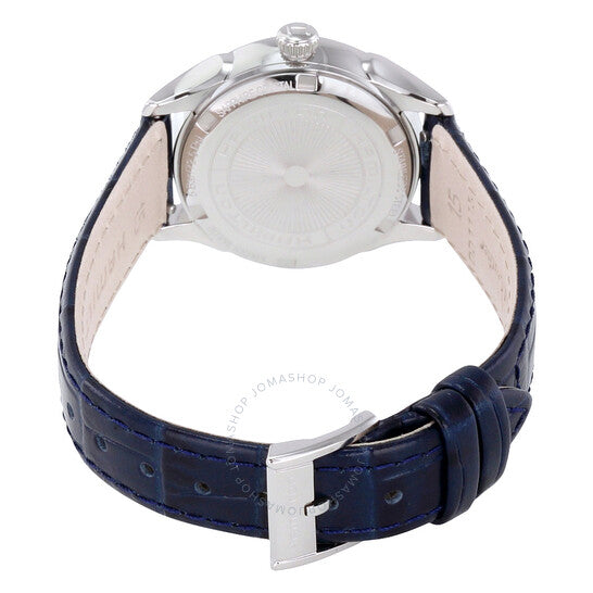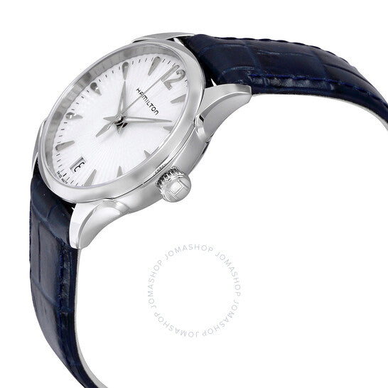 علبة من الفولاذ المقاوم للصدأ مع سوار جلدي أزرق. إطار ثابت من الفولاذ المقاوم للصدأ. ميناء فضي مع عقارب مضيئة فضية اللون ومؤشرات ساعات. يظهر رقم عربي عند موضع الساعة ١٢. علامات دقائق حول الحافة الخارجية. نوع الميناء: تناظري. عقارب مضيئة. عرض التاريخ عند موضع الساعة ٦. حركة كوارتز عيار F05.111. زجاج ياقوتي مقاوم للخدش. تاج قابل للسحب/الدفع. غطاء خلفي صلب. حجم العلبة: ٣٠ مم. سمكها: ٩ مم. شكلها دائري. عرض السوار: ١٥ مم. مشبك تانغ. مقاومة للماء حتى عمق ٥٠ مترًا / ١٦٥ قدمًا. الوظائف: التاريخ، الساعة، الدقائق، الثواني، مؤشر عمر البطارية. طراز ساعة رسمية. علامة الساعة: صناعة سويسرية. ساعة هاميلتون جازماستر نسائية بمينا فضي وجلد أزرق، طراز H42211655.