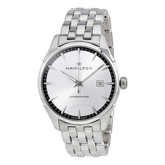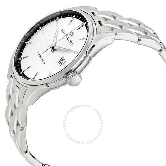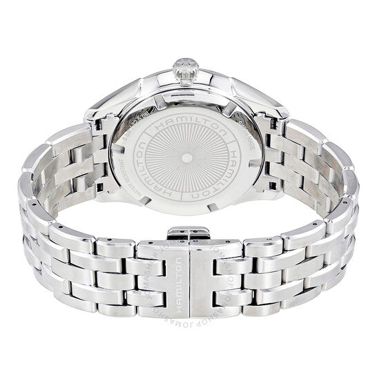 علبة من الفولاذ المقاوم للصدأ مع سوار من الفولاذ المقاوم للصدأ. إطار ثابت من الفولاذ المقاوم للصدأ. ميناء فضي مع عقارب مضيئة فضية اللون وعلامات ساعات. علامات دقائق حول الحافة الخارجية. نوع الميناء: تناظري. عقارب مضيئة. عرض التاريخ عند موضع الساعة 3. حركة كوارتز هاميلتون عيار F06.111. زجاج ياقوت مقاوم للخدش. تاج قابل للسحب/الدفع. غطاء خلفي صلب. حجم العلبة: 40 مم. سمكها: 10.2 مم. شكلها دائري. عرض السوار: 20 مم. مشبك قابل للطي. مقاومة للماء حتى عمق 50 مترًا / 165 قدمًا. الوظائف: التاريخ، الساعة، الدقائق، الثواني. تصميم كاجوال. علامة الساعة: صناعة سويسرية. ساعة هاميلتون جازماستر للرجال بمينا فضي H32451151.